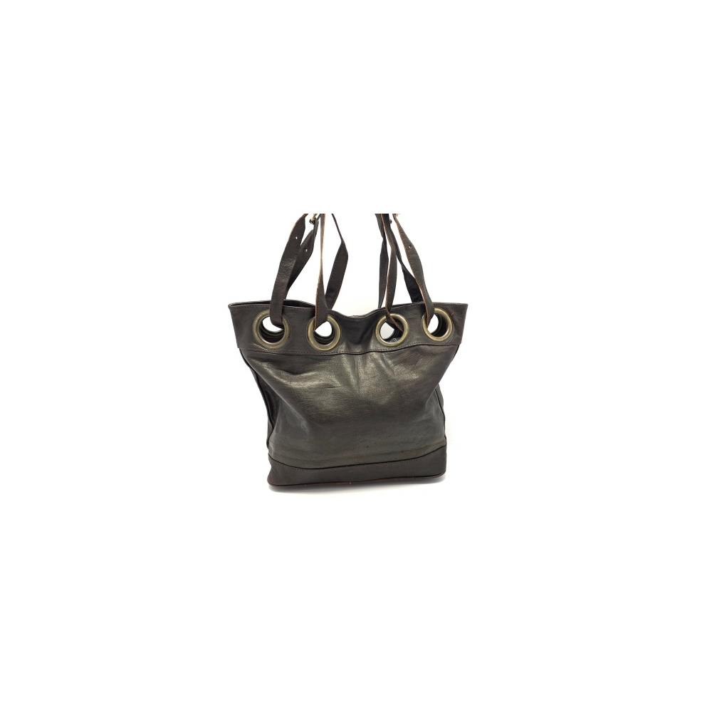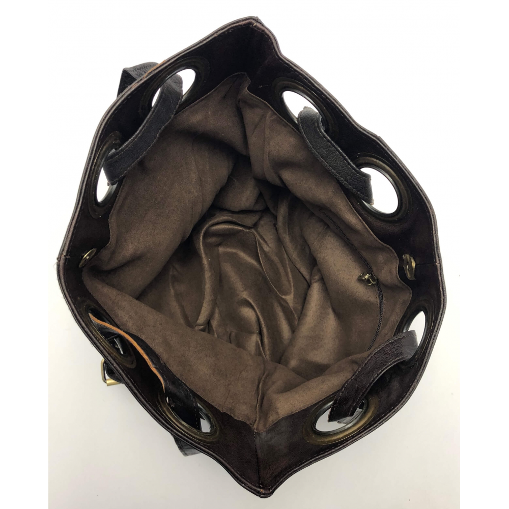 Dámská kožená kabelka s dvěma středníma ušima (délka max 26 cm), které je možno mírně zkrátit. Kabelka je v horní části ozdobena velkými kruhy velice zajímavě zakomponovanými do celého vzhledu kabelky. Kabelka je vypodšívkovaná a na vnitřní straně má malou kapsu na zip. Kabelka bude určitě krásným módním doplňkem, pokud si ji pořídíte do svého šatníku. Kabelka je ručně šitá z příjemné měkké kůže.