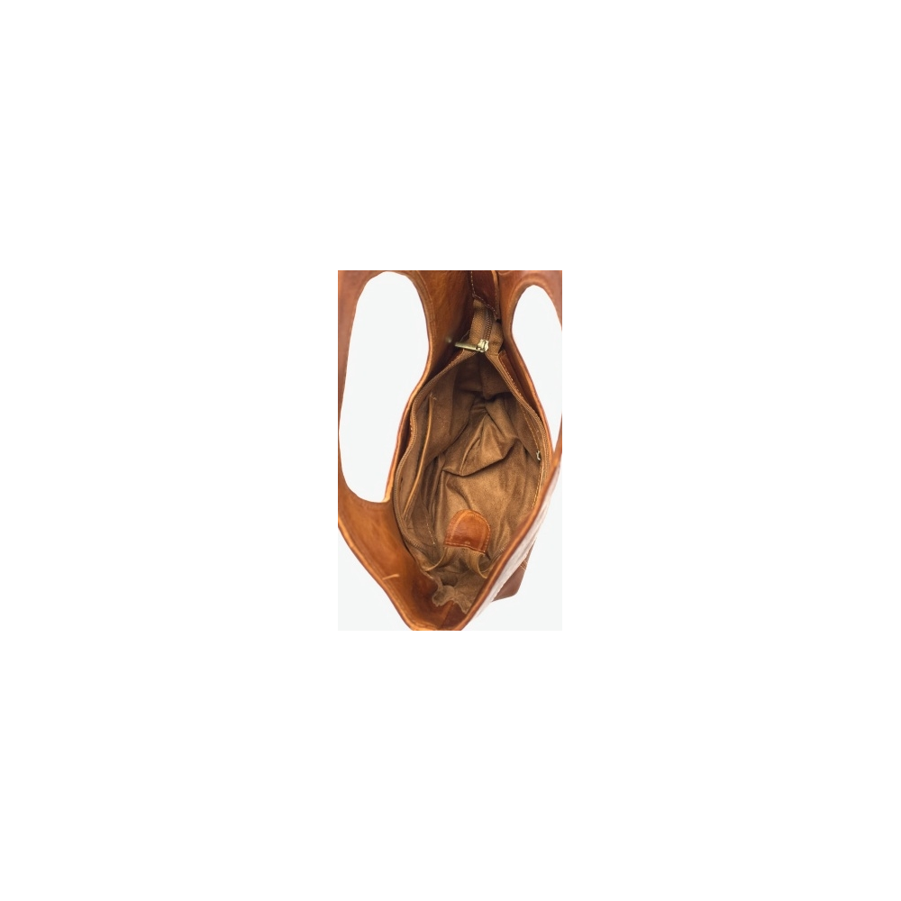 Dámská kožená kabelka vhodná na nošení v ruce nebo na předloktí. Kabela má ucho udělané jako kruh (průměr 16 cm), čímž je velice zajímavá a elegantní. Uvnitř má kabelka podšívku a malou kapsičku na zip na drobnosti, celkově je zaviratelná na zip.