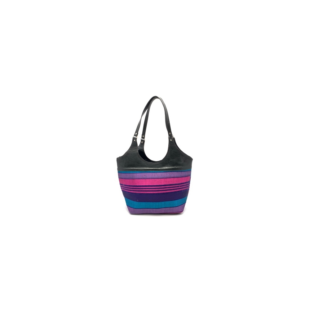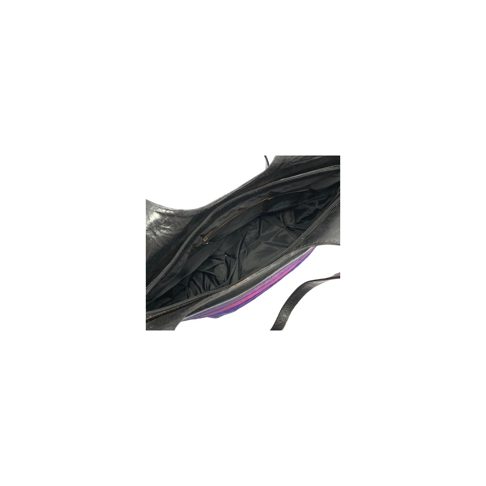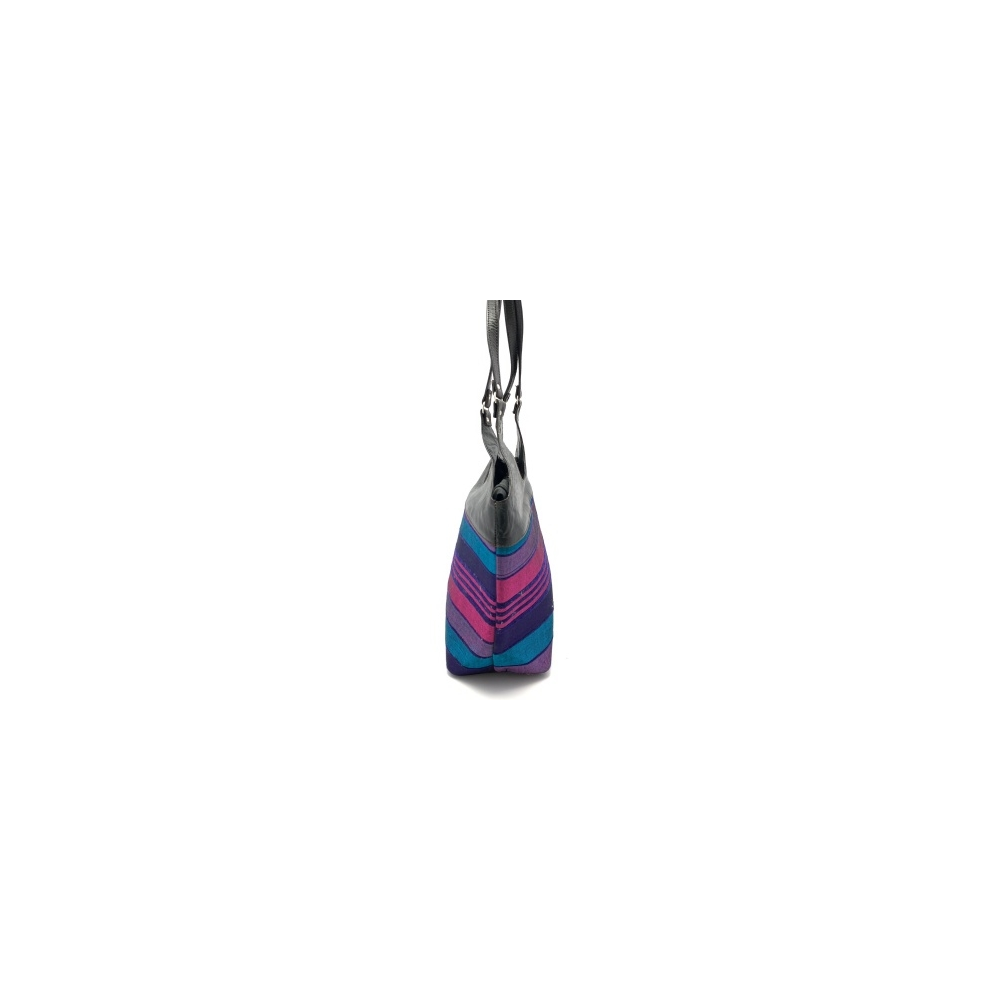 Dámská kabelka v kombinaci kůže a látka v elegantní černo-fialovo-modré barvě. Kabelka má dvě středně dlouhé uši (délka 34 cm), je zavírací na zip. Uvnitř je malá kapsička na zip na vaše drobnosti. Kabelka se výborně hodí k volnočasovému oblečení nebo k jednobarevnému společenskému oděvu, kde bude výrazným doplňkem.