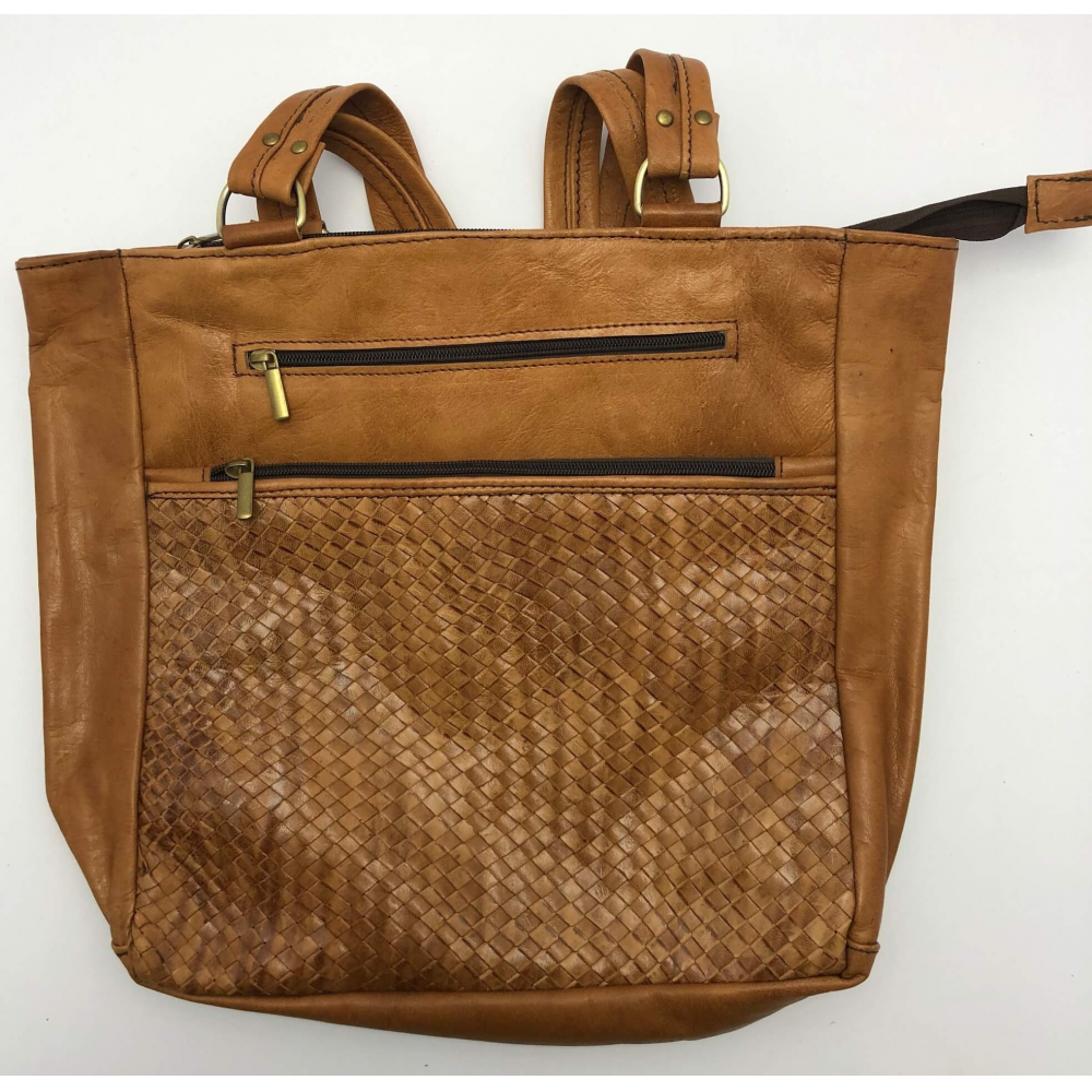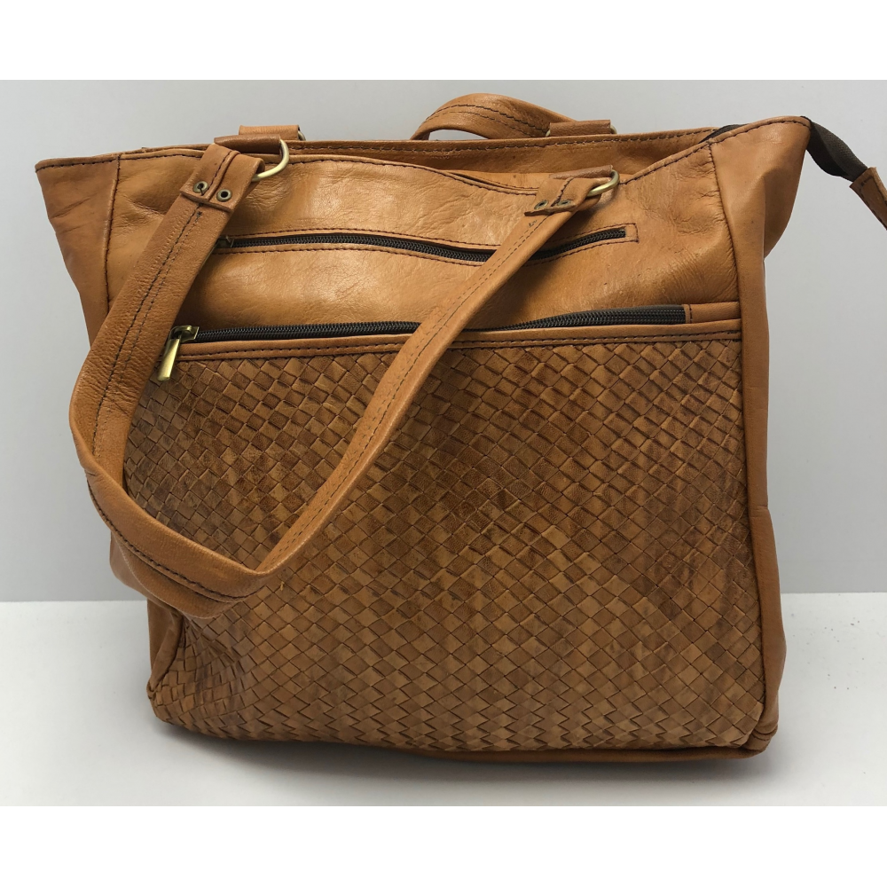 Dámská kožená kabelka obdélníkového tvaru na dvě středně dlouhé uši (25 cm délka uší). Kabelka je vyrobena z příjemné měkké hovězí kůže. Kabelka má na přední straně proplétaný vzor, z venku dvě kapsy na zip, kam si pohodlně schováte Vaše drobnosti nebo cennosti. Kabelka je uvnitř podšívková a na zadní straně má malou kapsičku na zip, kde si uložíte drobnosti a jiné menší věci. Nahoře je kabelka zapínací na zip.
