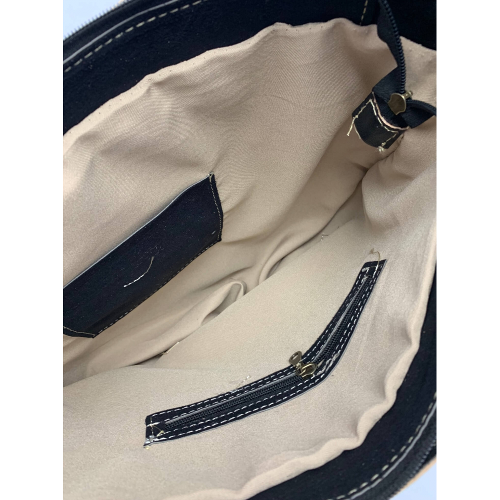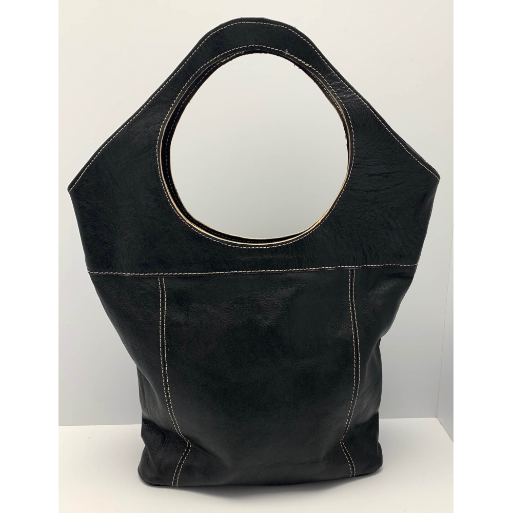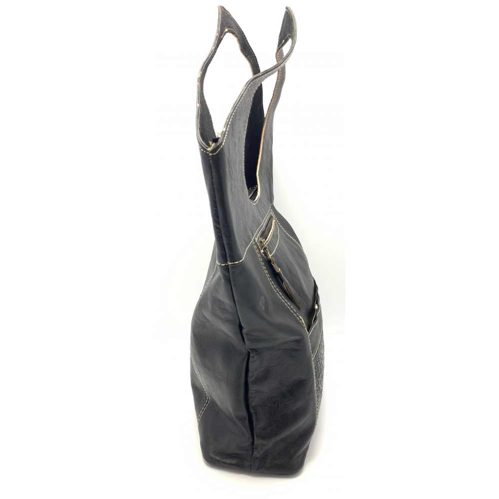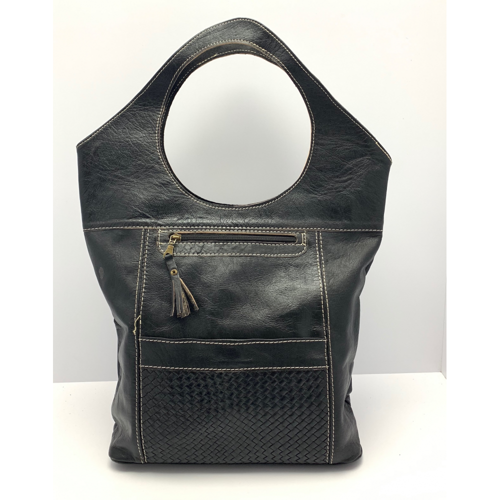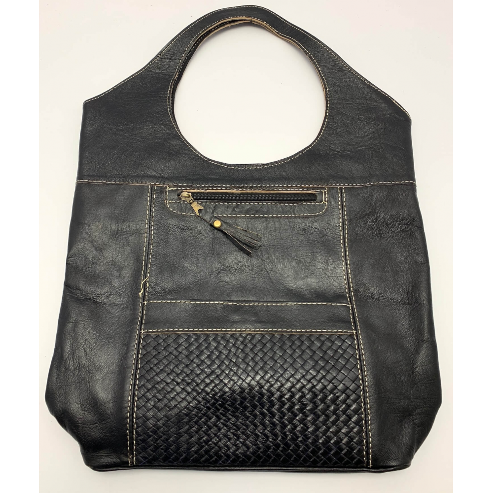 Dámská kožená velice moderní kabelka ručně šitá. Kabelka má místo ucha kulatý otvor, díky kterému se vám bude velice příjemně nosit na rameni, v ruce nebo i na předloktí. Kabelka má z přední strany velkou kapsu na zip a ve spodní části kapsu, která je ozdobně propletena kůží. Uvnitř má kabelka podšívku a kapsičku na zip na drobnosti, cennosti a věci, které chcete mít oddělené od věcí ve velkém prostoru. Tuto módní kabelku hned tak na našem trhu nepotkáte, máme na skladě pouze jeden kus a tak budete mít originál.