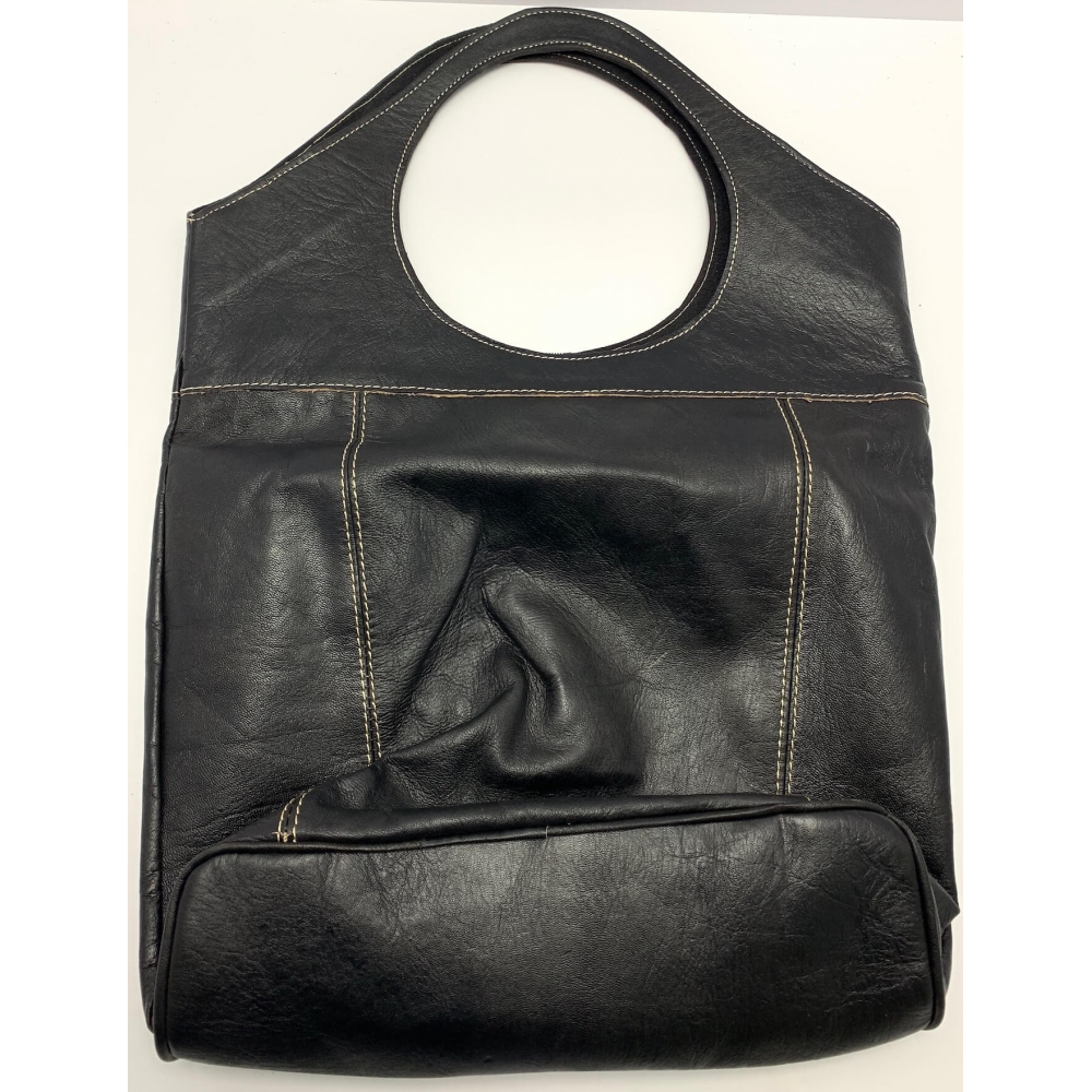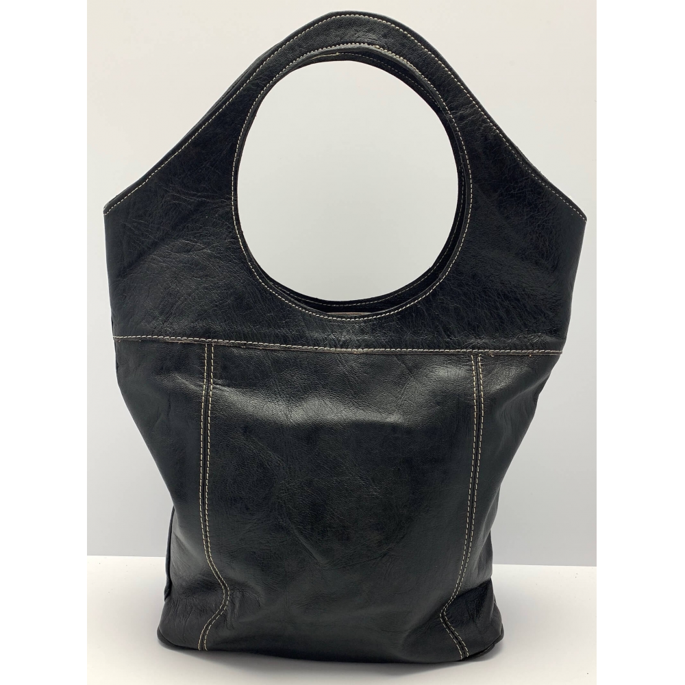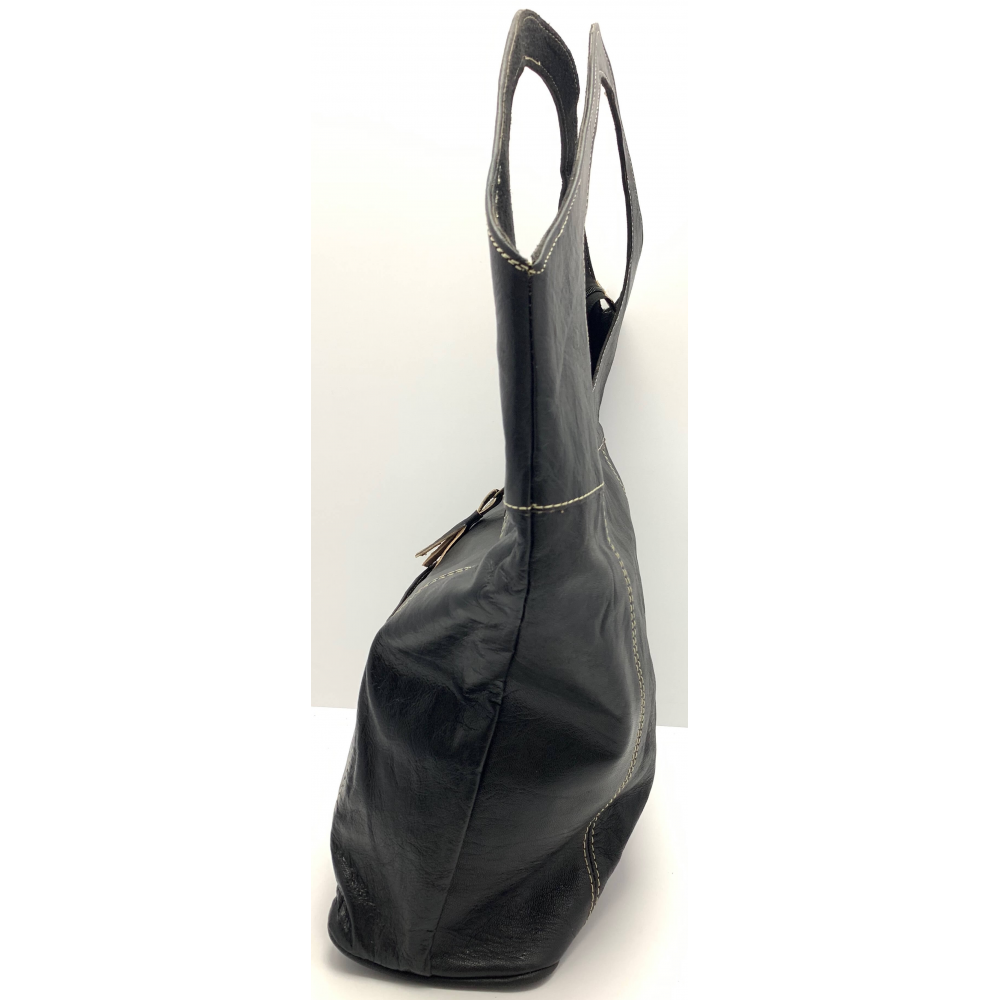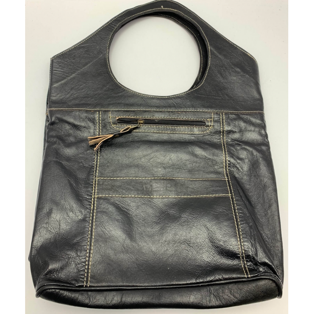 Dámská kožená velice moderní kabelka ručně šitá. Kabelka má místo ucha kulatý otvor, díky kterému se vám bude velice příjemně nosit na rameni, v ruce nebo i na předloktí. Kabelka má z přední strany velkou kapsu na zip a ve spodní části kapsu, kam si můžete odložit věci, které chcete mít pořád hned po ruce. Uvnitř má kabelka podšívku a kapsičku na zip na drobnosti, cennosti a věci, které chcete mít oddělené od věcí ve velkém prostoru. Tuto módní kabelku hned tak na našem trhu nepotkáte, máme na skladě pouze jeden kus a tak budete mít originál.