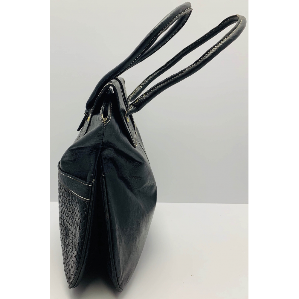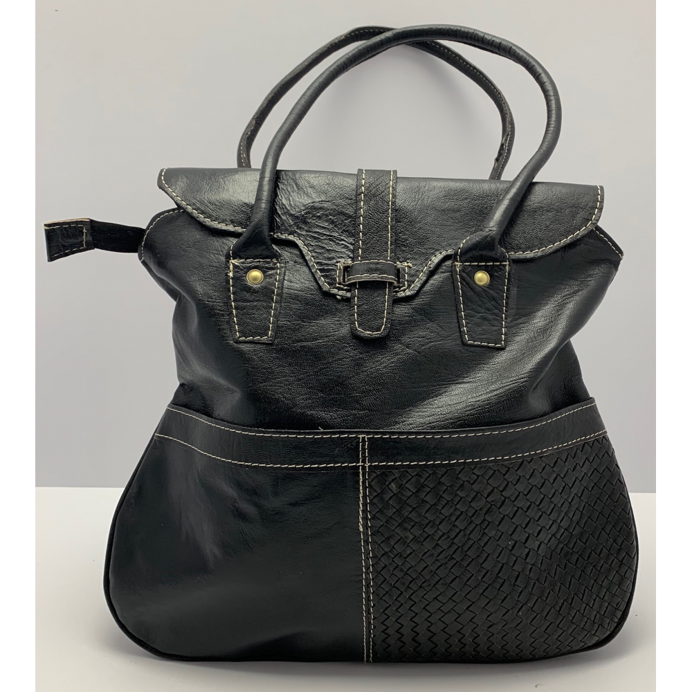 Dámská kožená kabelka z jemné hovézí kůže ručně šitá. Kabelka má dvě středně dlouhé uši (20 cm), takže ji můžete pohodlně nosit v ruce, na předloktí nebo i na rameni. Kabelka je na přední straně ozdobně olemovaná světlou nití okolo přehybu a okolo kapes. Na přední straně má dvě kapsy v dolní polovině, z nichž jedna je ozdobně propletená kůží. Kabelka se zavírá na zip a překlop, který je zavírací na pásek, tak, aby byly vaše věci v bezpečí. Uvnitř má kabelka podšívku, malou kapsu na zip na drobnosti a kapsičku na mobilní telefon.