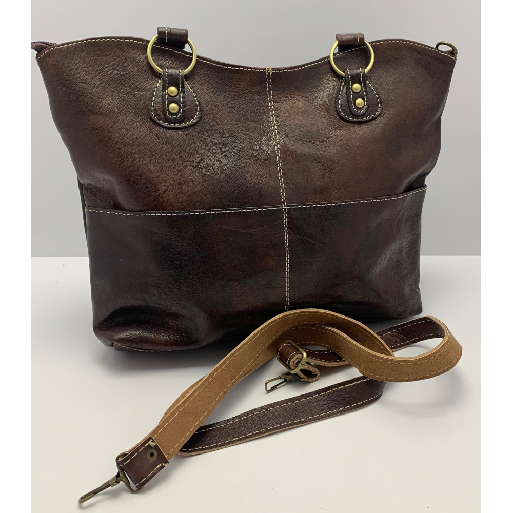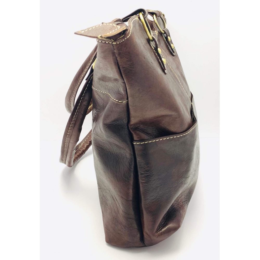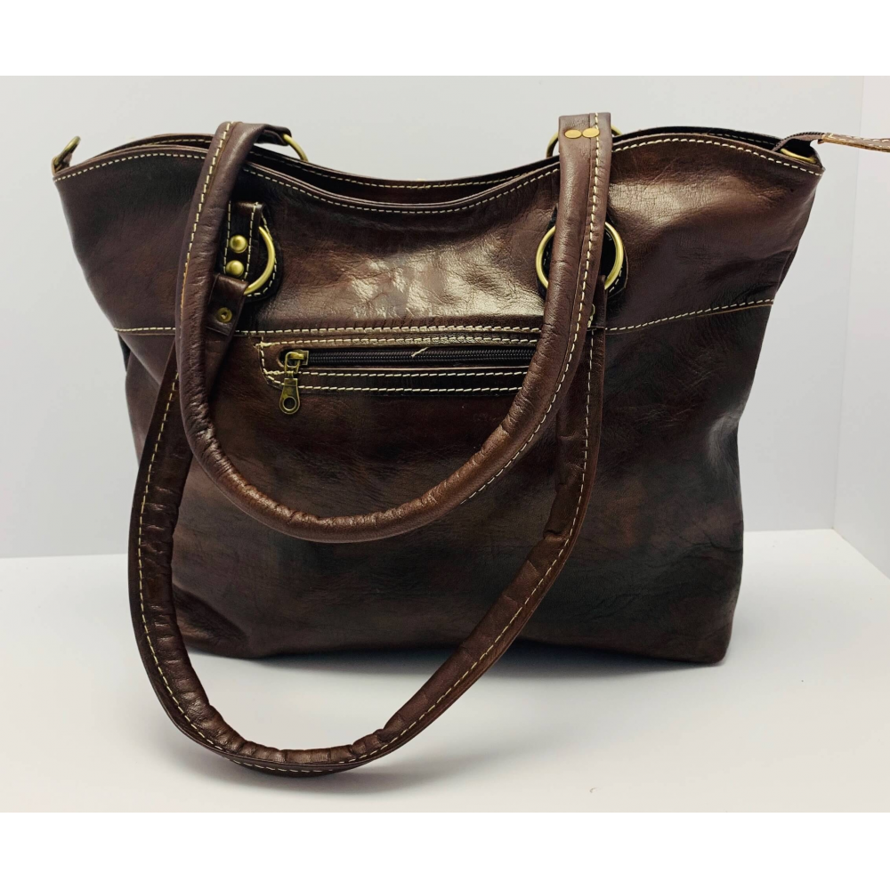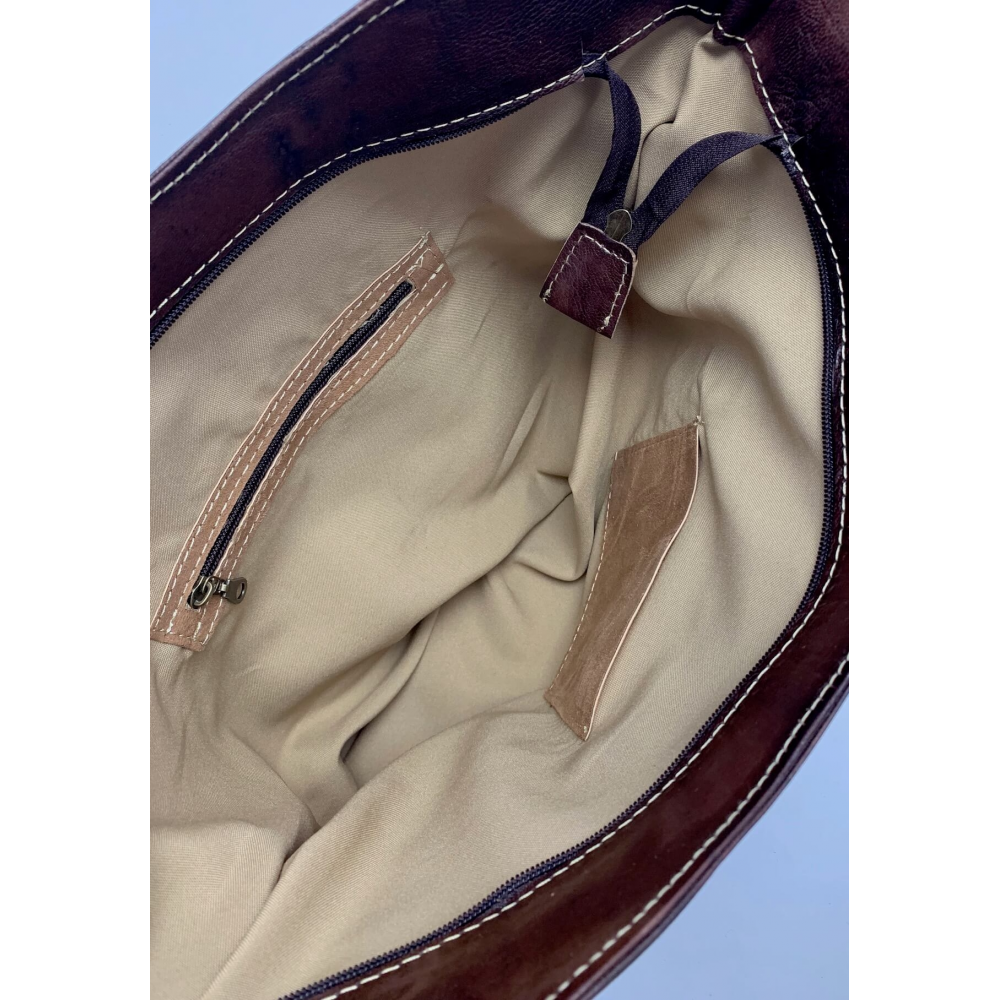 Dámská kožená kabelka střední velikosti ručně šitá z jemné hověží kůže na dvě středně dlouhé uši (23 cm). Kabelka má dlouhé odebínací ucho (max délka 60 cm), které je možno na délku upravit. Kabelka je velice zajímavě řešená, na přední straně má ve spodní polovině dvě kapsičky a celká je prošitá světlou nití do kříže. Na zadní straně má malou kapsičku na zip na Vaše drobnosti. Kabelka má uvnitř podšívku, malou kapsičku na zip a místo na odkládání mobilního telefonu. Kabelka je v horní části moderně vykrojena do půlkulatého mírného zakřivení. Kabelka bude určitě Vaším krásným doplňkem, pokud se ji rozhodnete zakoupit. Nosit ji můžete k elegantnímu oblečení i k volnočasovému.
