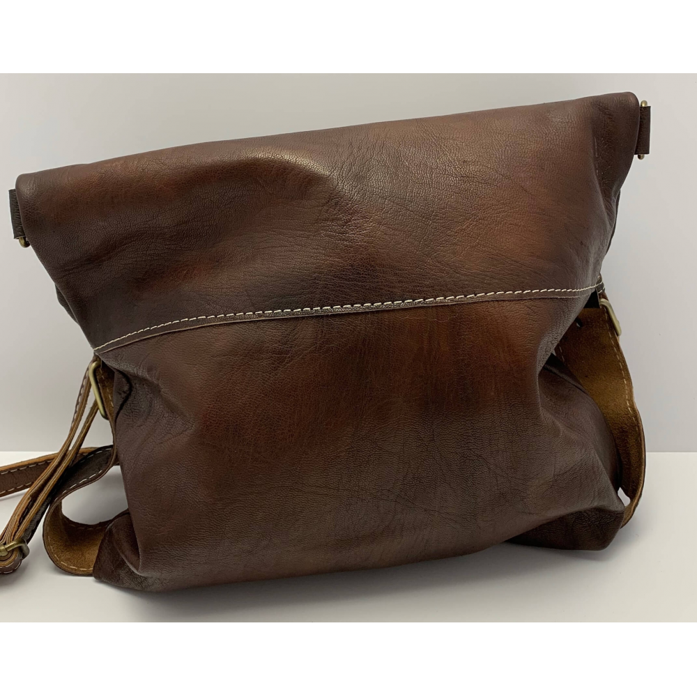 Dámská kožená kabelka s překlopem, která je velice zajímavé řešená - můžete ji nosit celou otevřenou, kdy má rozměr na výšku 42 cm, nebo je možno kabelku nosit přehnutou, kdy má výšku 30 cm. Při překlopení kabelky na kratší délku, je kabelka zavírací na dvě patentky. Kabelky vzhled je zajímavě ozdoben ozdobnými přezkami. Má dlouhé nastavitelné ucho - max délka je 68 cm. Při otevření má kabelka z přední strany dvě kapsy na zip, na zadní straně je jedna velká kapsa na zip. Kabelka má podšívku, uvnitř má malou kapsu na zip na drobnosti nebo cennosti a kapsičku na mobilní telefon. Kabelka je ručně šitá z ručně barvené velice příjemné měkké hovězí kůže.