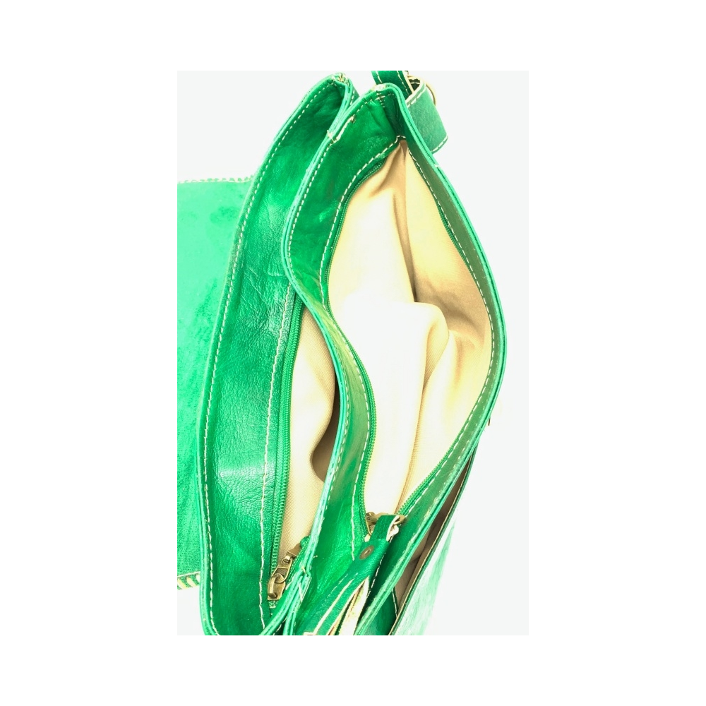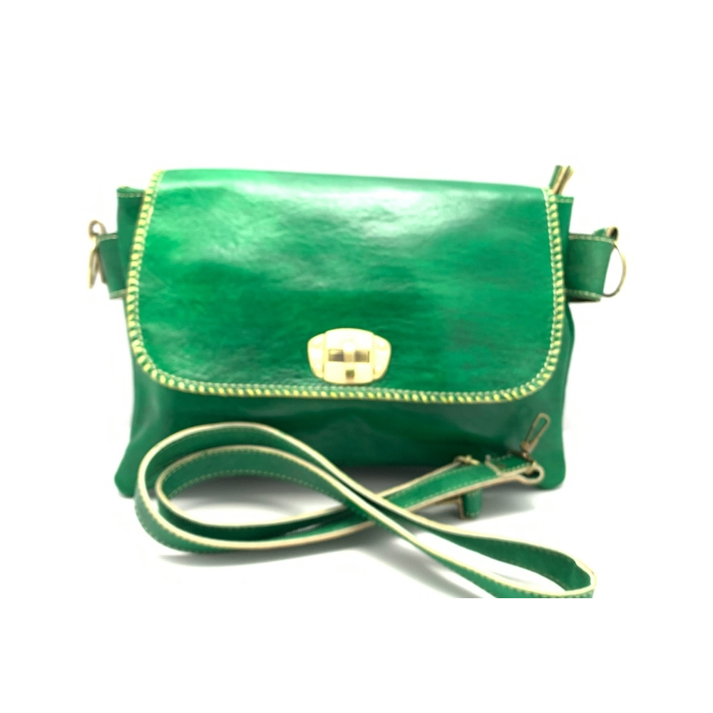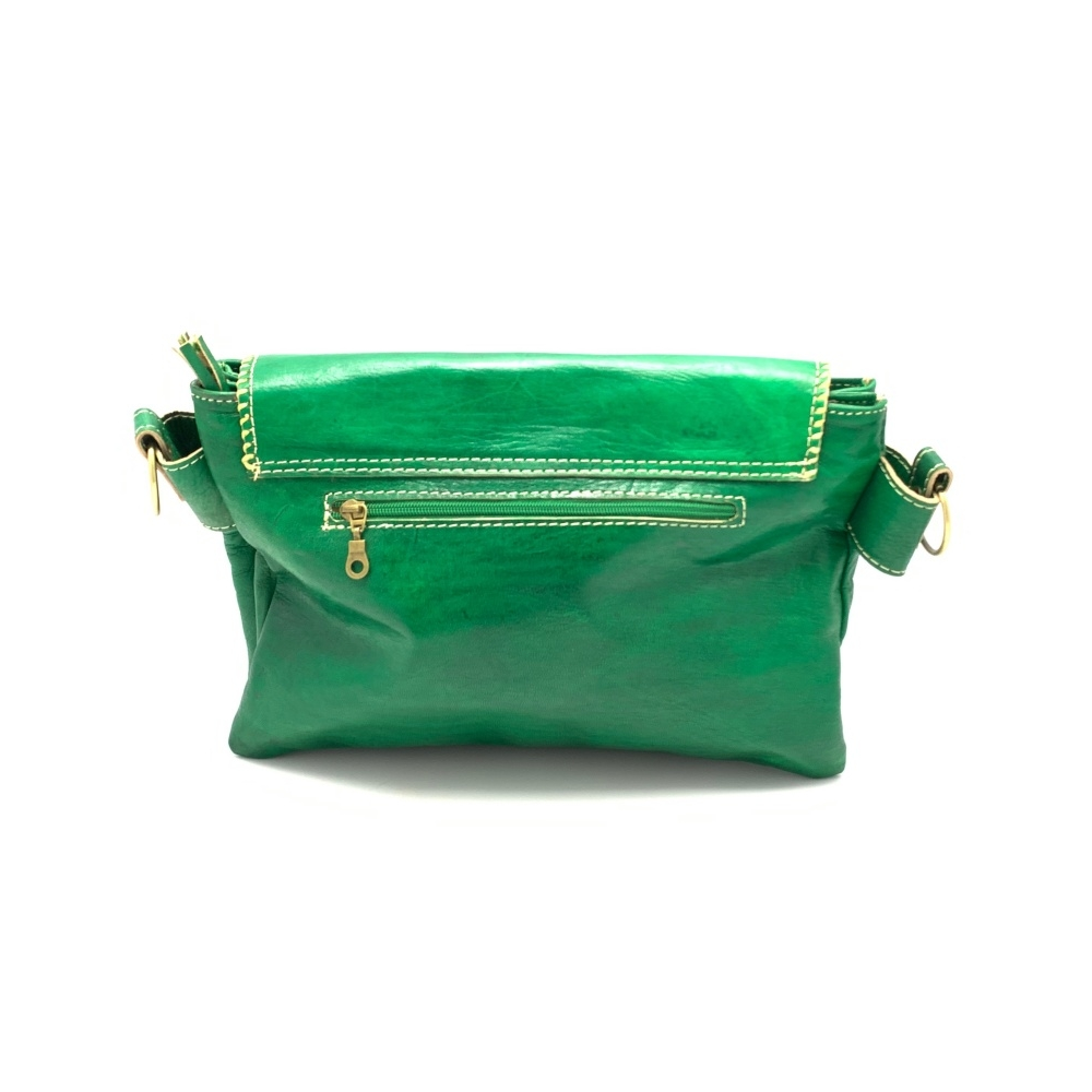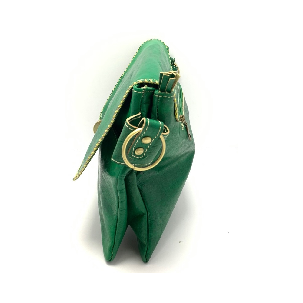 Dámská luxusní kožená kabelka ve tvaru psaníčka přes rameno je z ručně barvené kůže s ozdobným obšitím okolo víka kabelky.