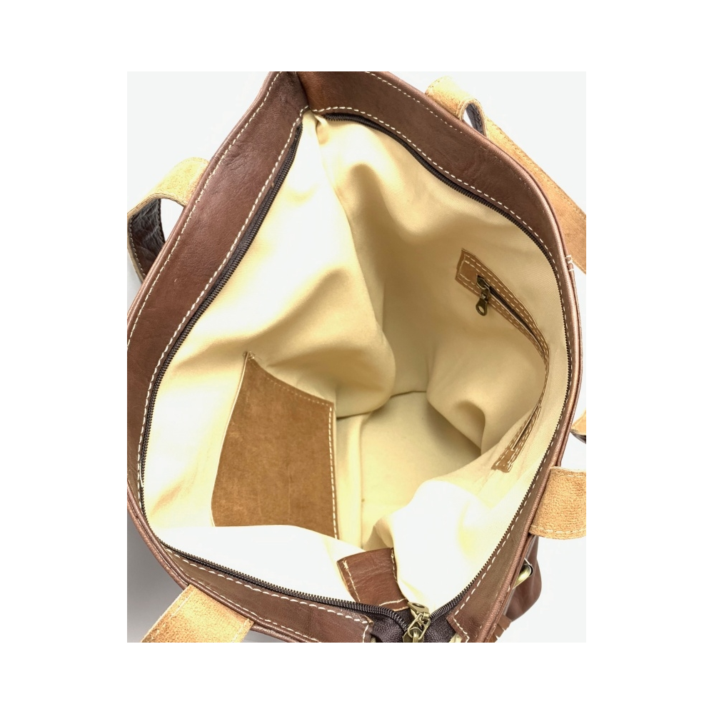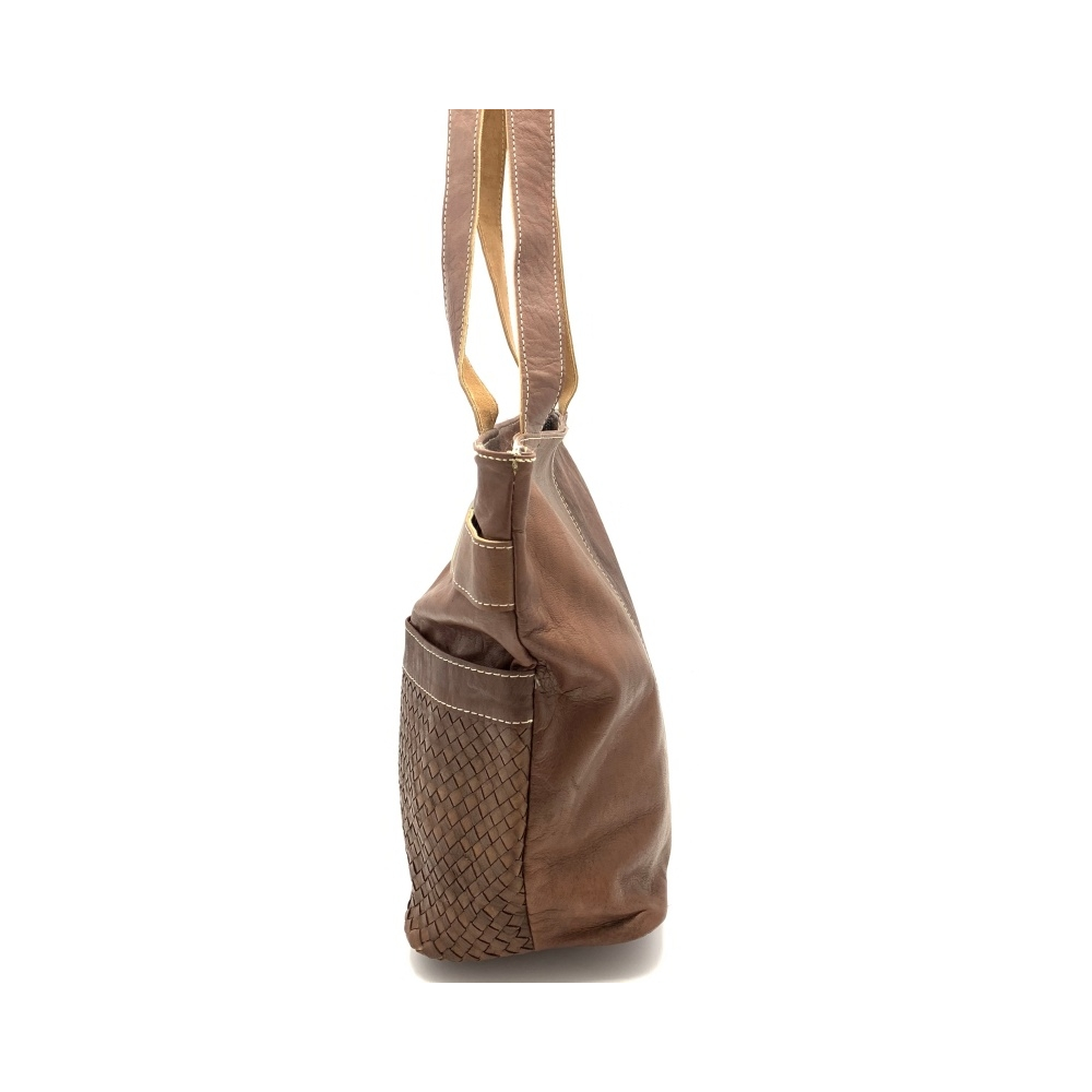 Dámská kožená kabelka ručně šitá zajímavě řešená, obdelníkového tvaru na výšku. Kabelka má v horní polovině pásek propletený přes kovové otvory celou kabelkou dokola, čímž má kabelka velice zajímavý a moderní vzhled. Ve spodní polovině přední části je kapsa na zip a ve druhé části hluboká kapsa ozdobená průpletem kůže, kam si můžete pohodlně ukládat svoje věci. Kabelka má podšívku, v níž je na zadní straně kabelky malá kapsička na zip. Kabelka má dvě uši dlouhé 33 cm. Tato kabelka bude Váš módní moderní doplněk jak k elegantnímu oblečení, tak na volný čas.