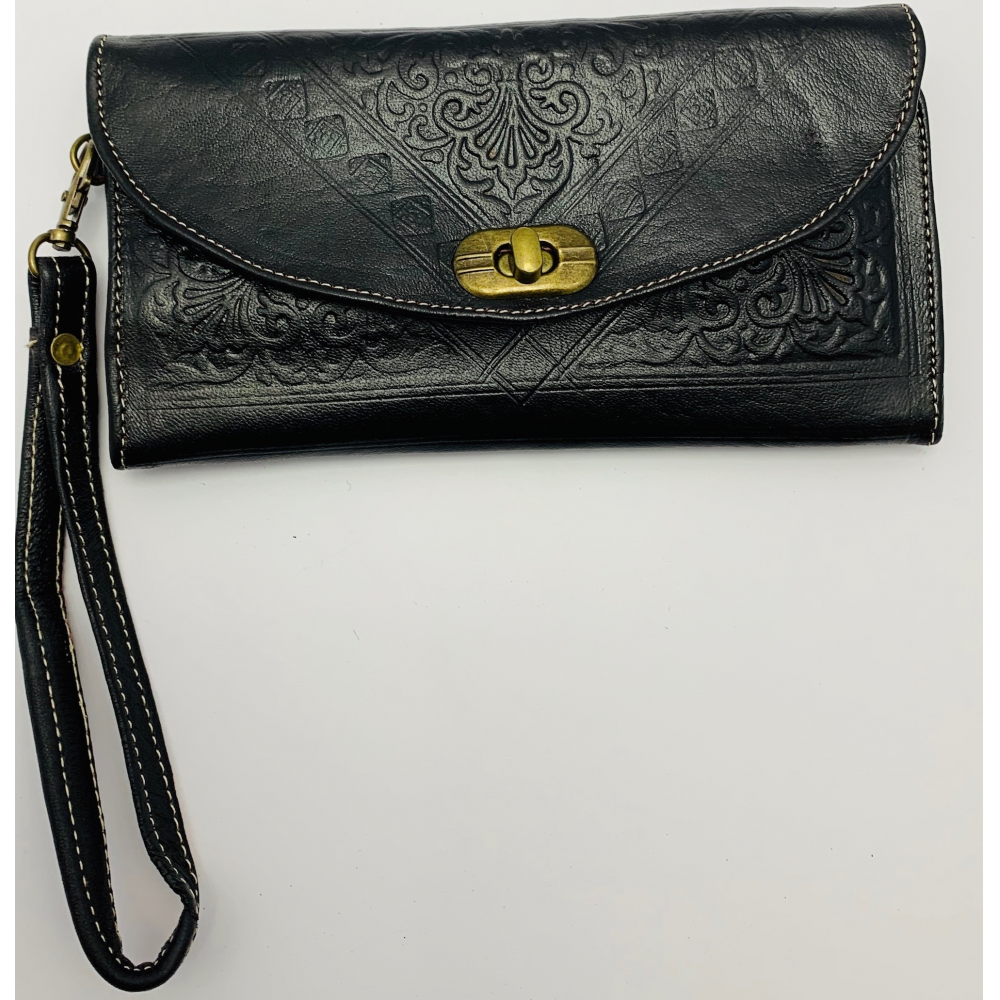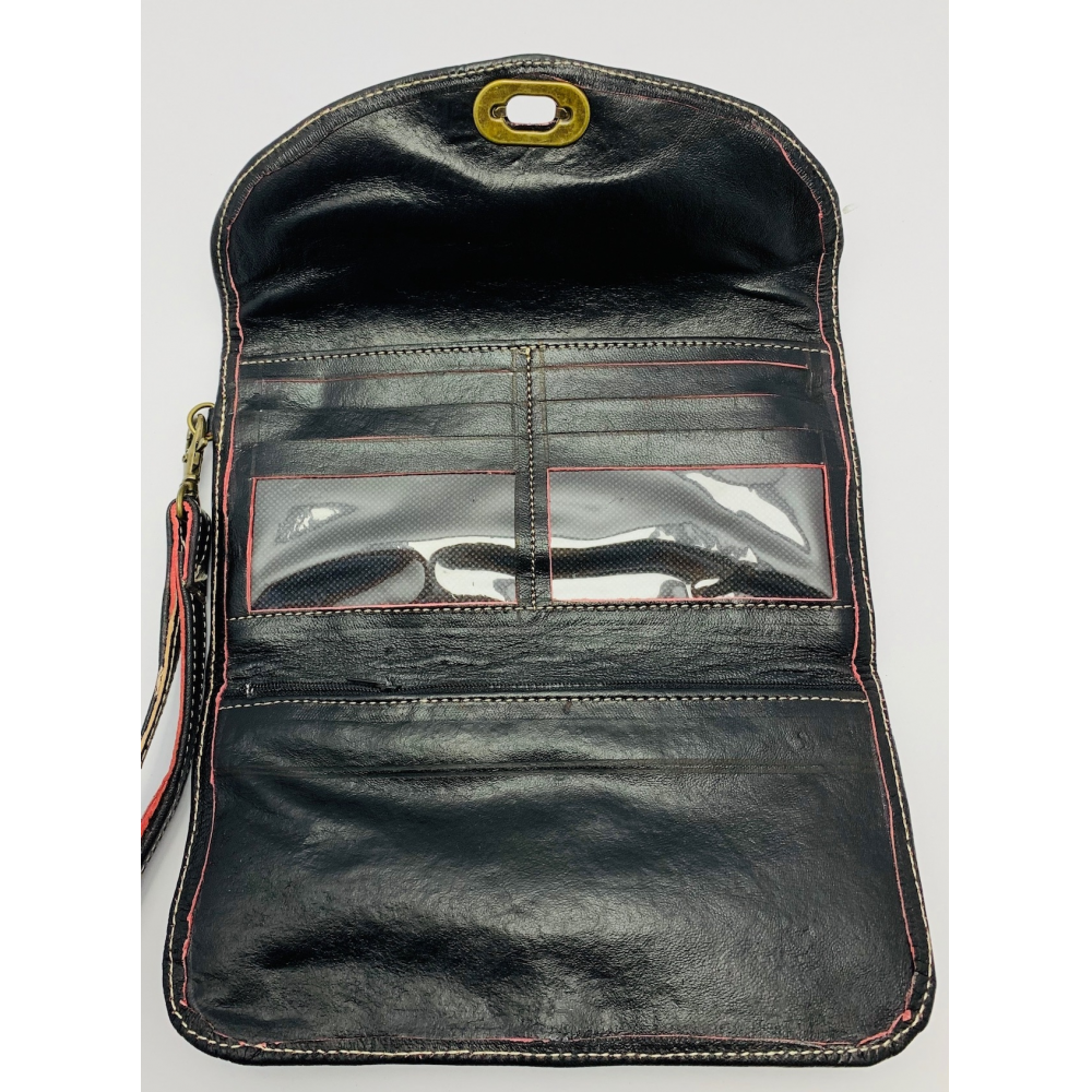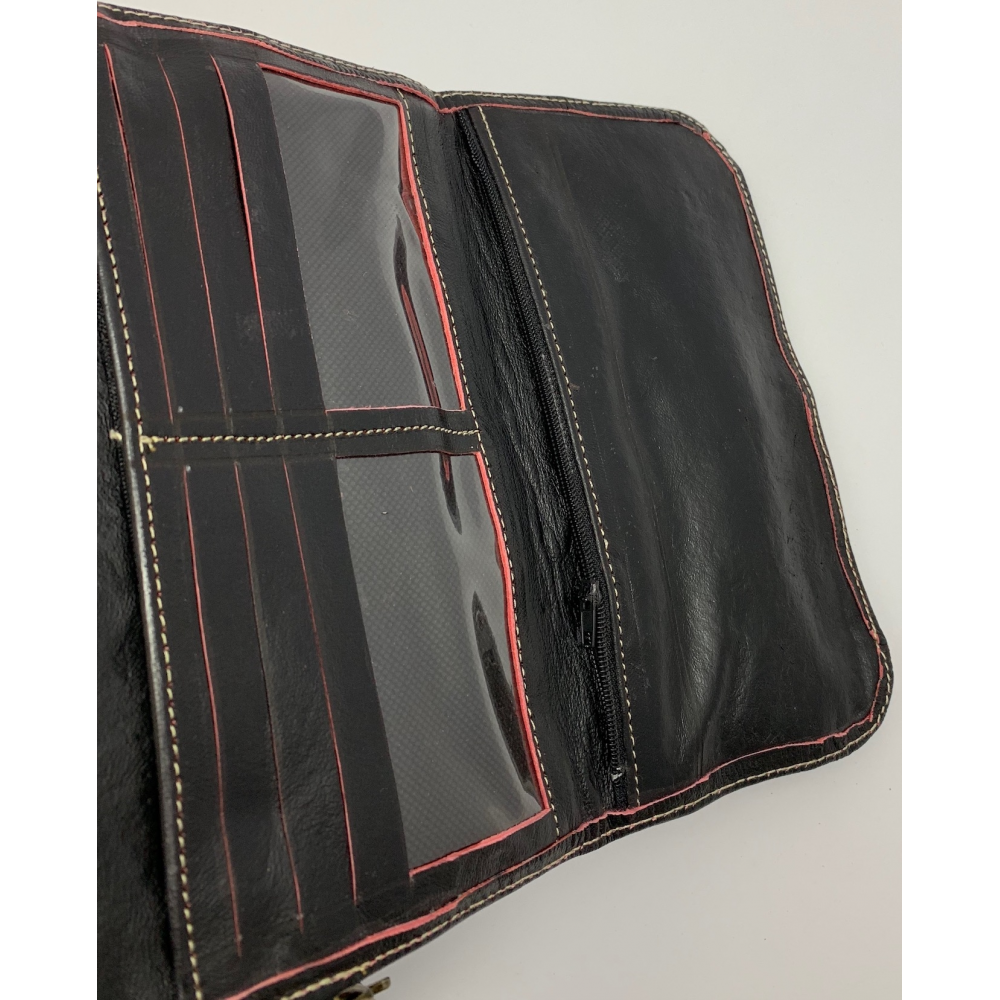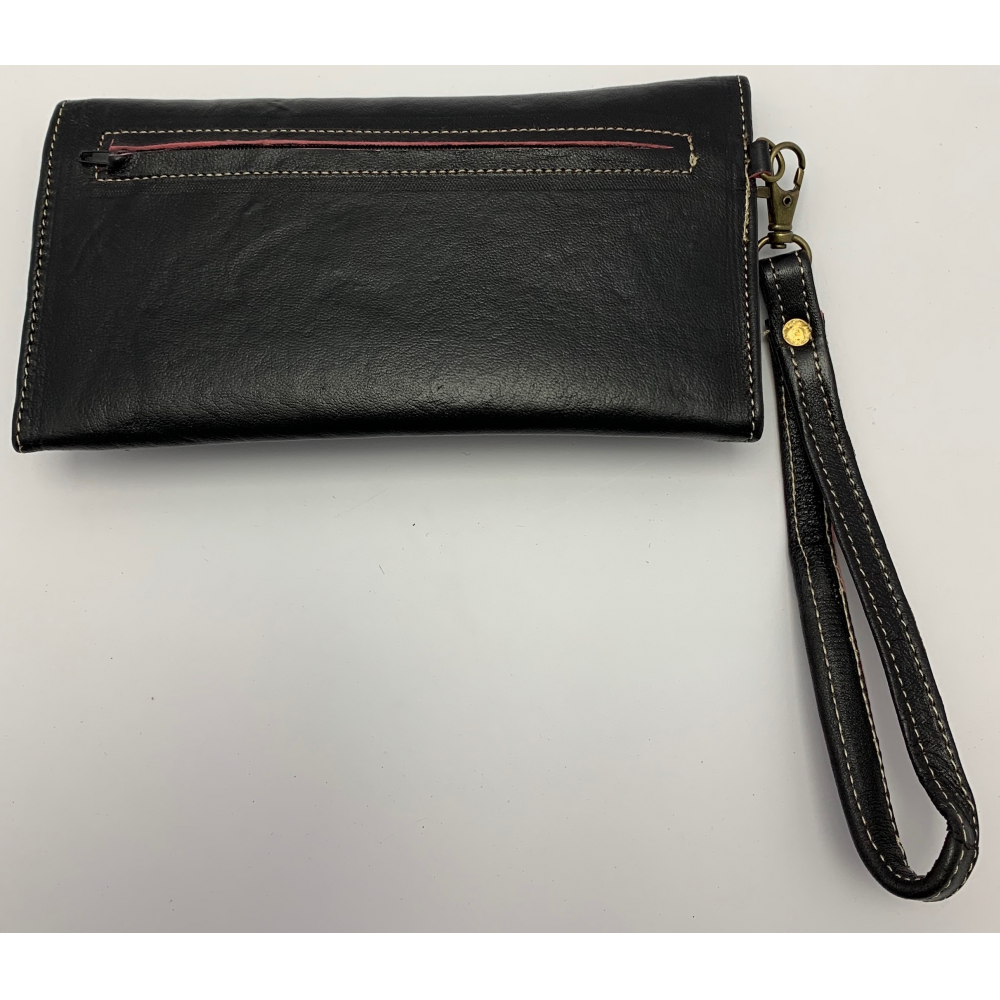 Dámská kožená peněženka velká zapínací na otočný knoflík. Peněženka se celá rozevře, má přihrádky na karty, kapsu na drobné mince zavírací na zip, přihrádku na peníze a velkou přihrádku po celé délce peněženky. Peněženka je v rozevřeném stavu velká 21 cm, zavřená 12 cm.
