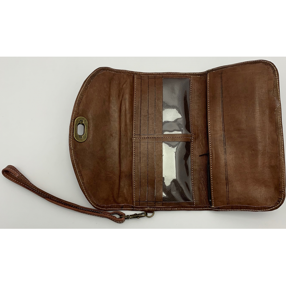 Dámská kožená peněženka velká zapínací na otočný knoflík. Peněženka se celá rozevře, má přihrádky na karty, kapsu na drobné mince zavírací na zip, přihrádku na peníze a velkou přihrádku po celé délce peněženky. Peněženka je v rozevřeném stavu velká 21 cm, zavřená 12 cm.