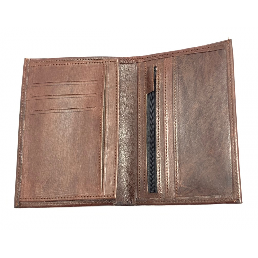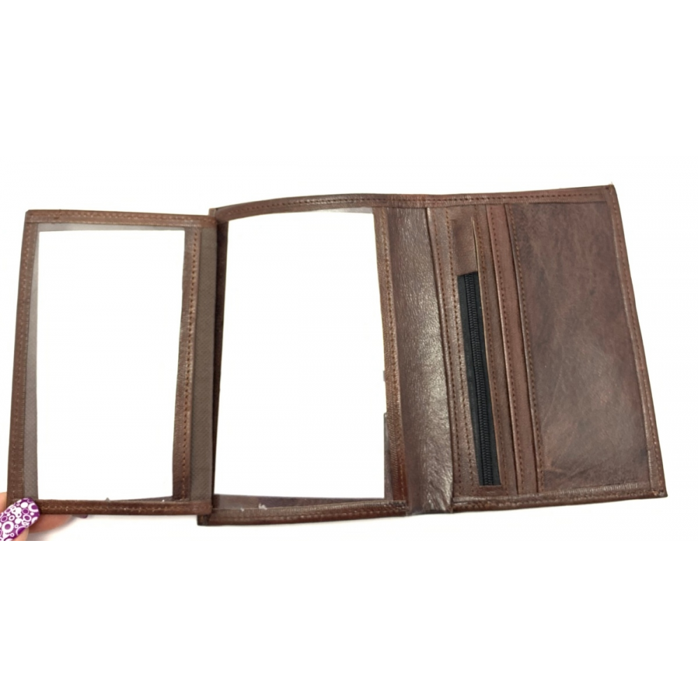 Kožená pánská peněženka, která má po rozevření místo na drobné mince (přihrádka na zip), místo na karty a vizitky, dále se peněženka na levé straně rozevře a je zde místo na doklady. Místo na papírové peníze je z vrchu.