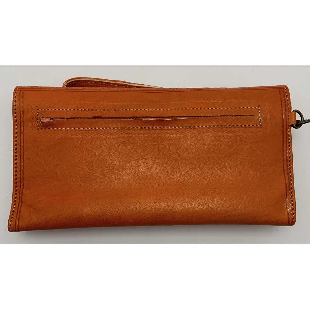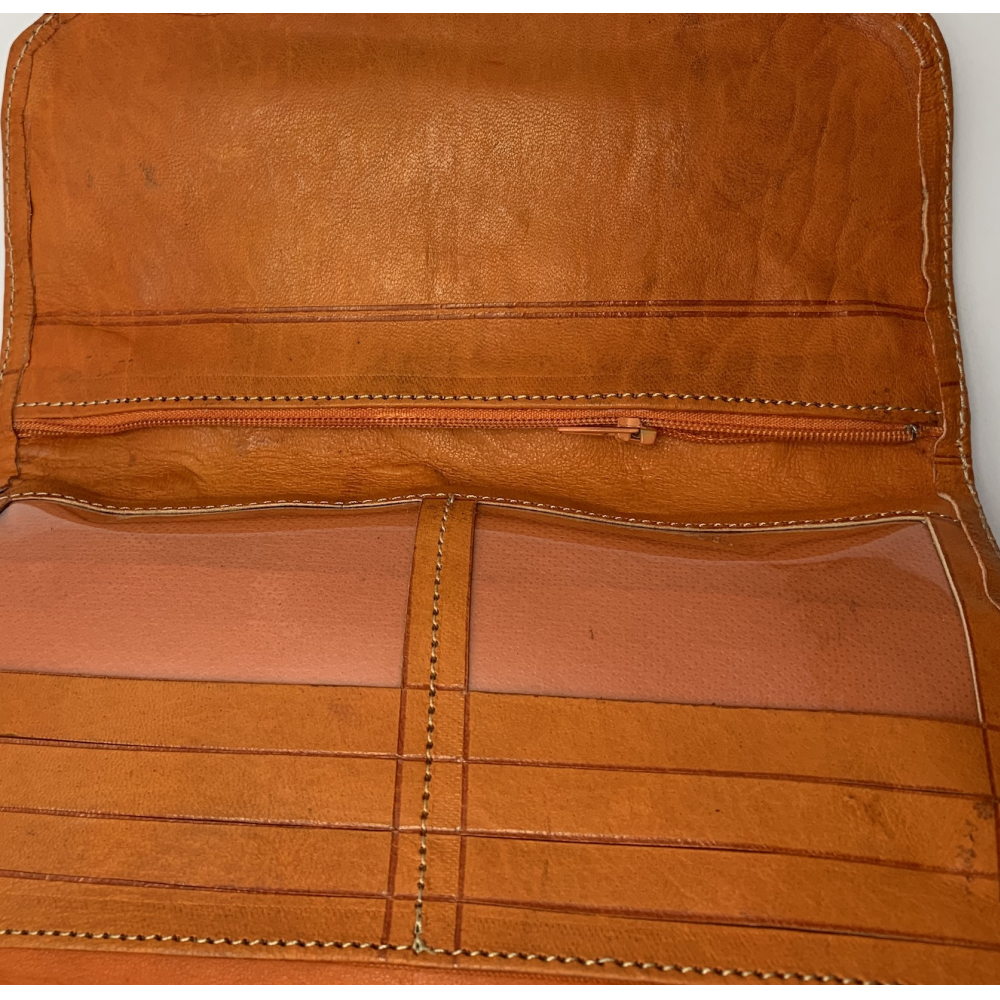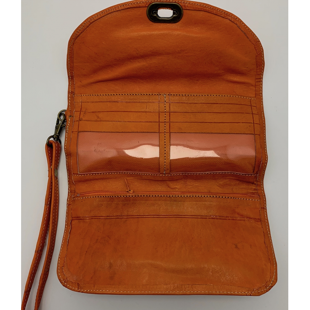 Dámská kožená peněženka velká zapínací na otočný knoflík. Peněženka se celá rozevře, má přihrádky na karty, kapsu na drobné mince zavírací na zip, přihrádku na peníze a velkou přihrádku po celé délce peněženky. Peněženka je v rozevřeném stavu velká 21 cm, zavřená 12 cm.