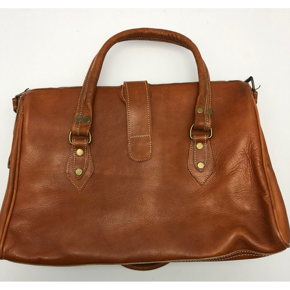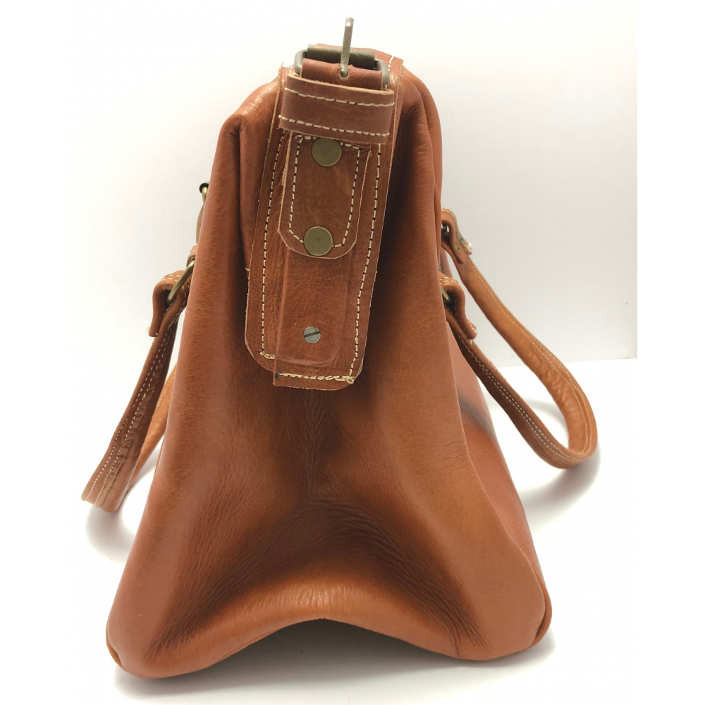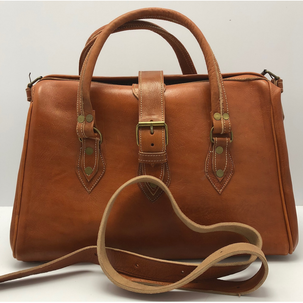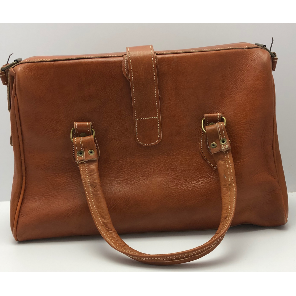 Velká cestovní kožená taška s podšívkou. zavírání na přezku, z boku železné výztuhy při zavírání - styl doktorská taška. Dvě krátké uši (25 cm) a jedno dlouhé nastavitelné (max 73 cm).