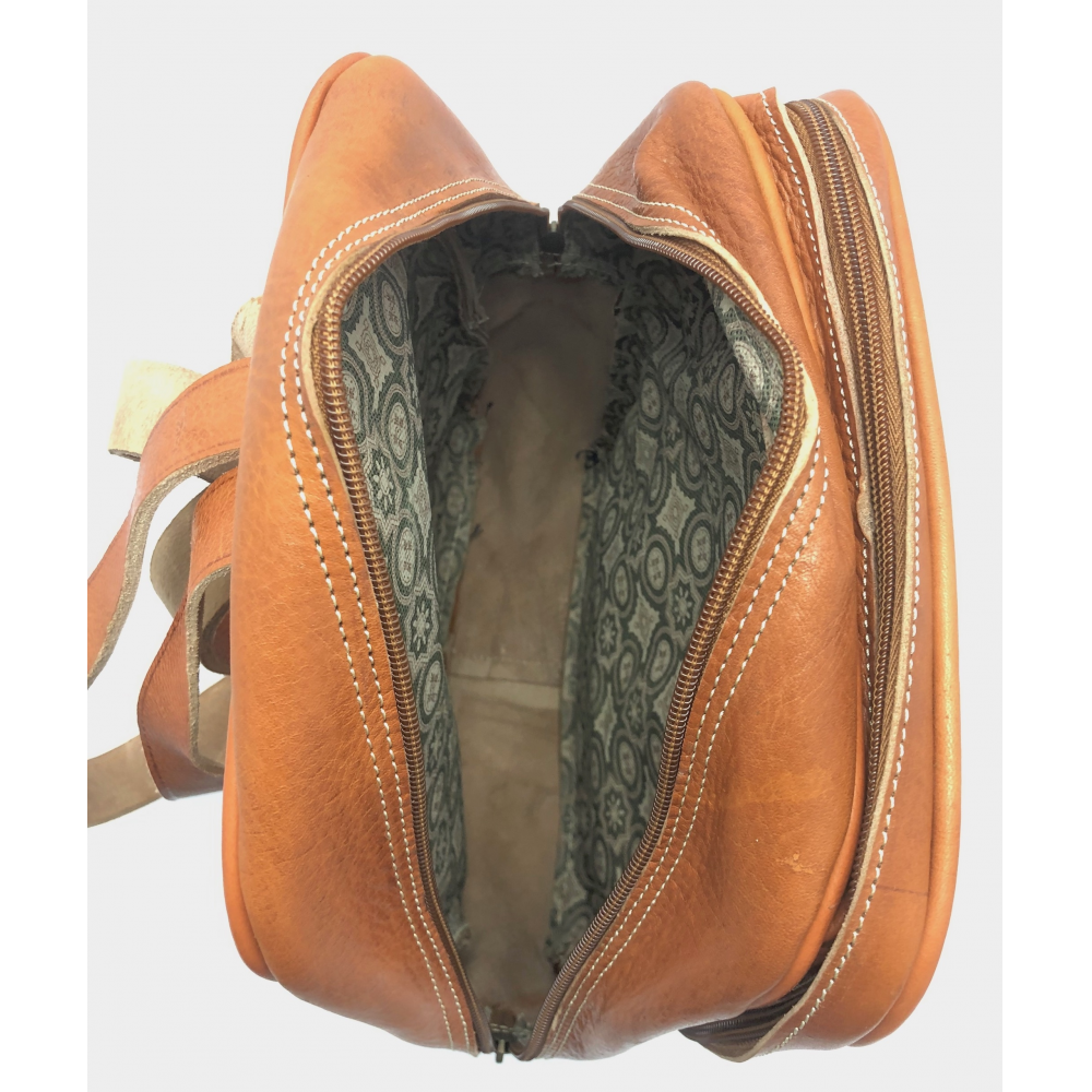 Batoh střední velikosti z kůže se dvěma nastavitelnými popruhy (max délka 45 cm). Batoh má podšívku a uvnitř malou kapsičku na zip na zadní straně batohu. Batoh je koncipován se zavíráním na zip - jeden větší prostor a jeden manší. Další uzavírací kapsička na zip je na čelní straně batohu.
