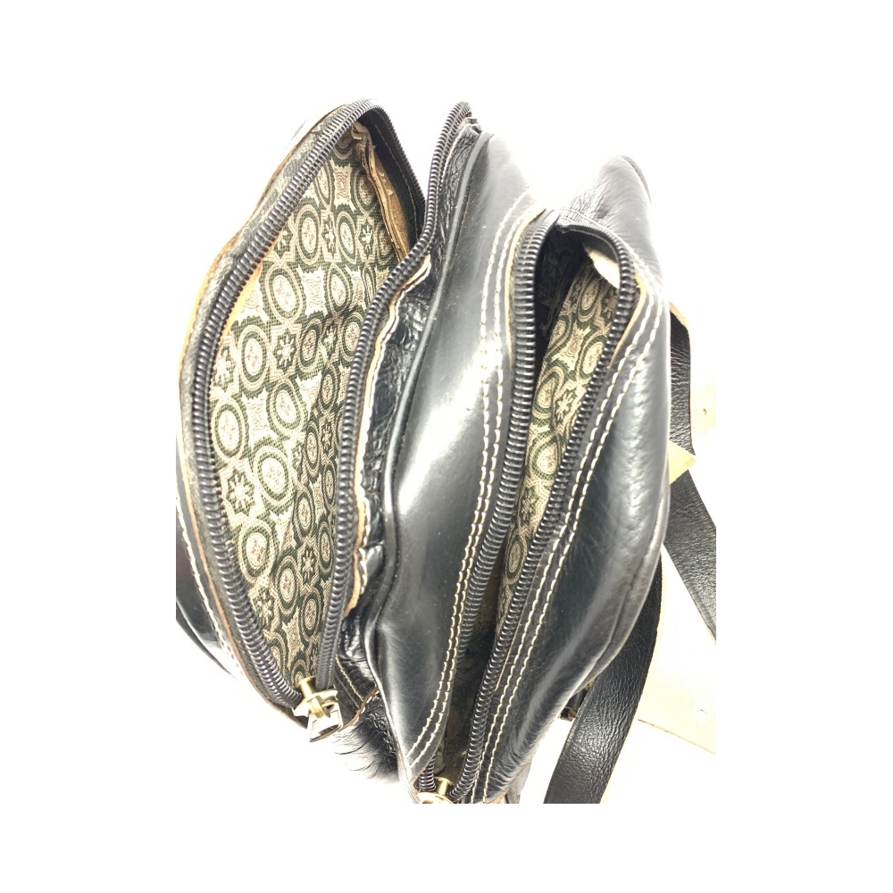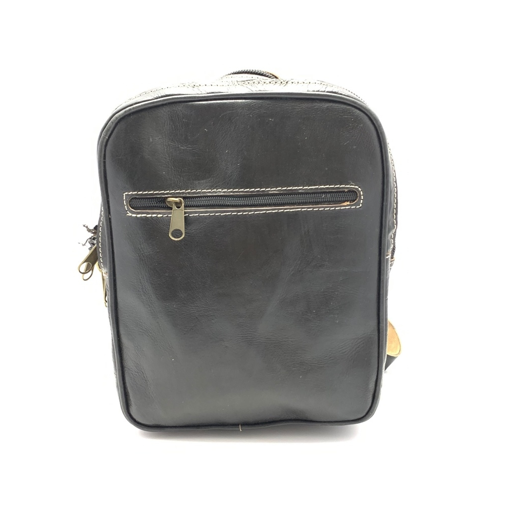 Batoh menší velikosti z kůže se dvěma nastavitelnými popruhy (max délka 50 cm). Batoh má podšívku a uvnitř malou kapsičku na zip na zadní straně batohu. Batoh je koncipován se zavíráním na zip - jeden větší prostor a jeden menší. Další uzavírací kapsička na zip je na čelní straně batohu.