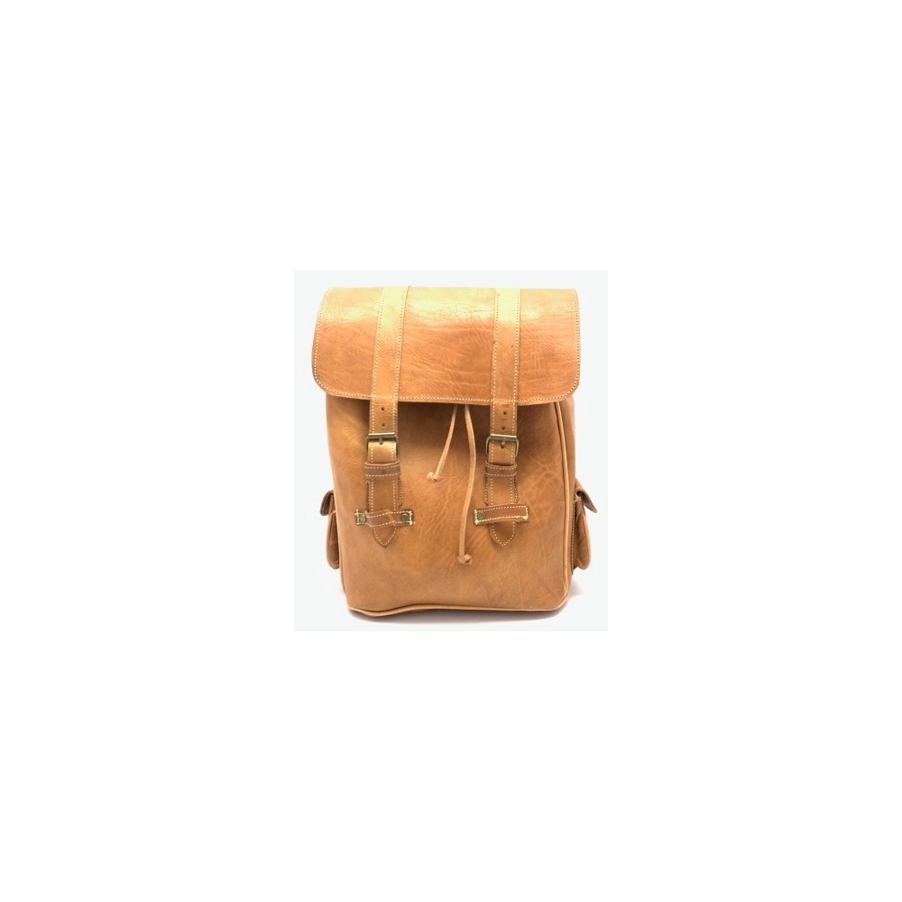 Batoh střední velikosti z kůže se dvěma nastavitelnými popruhy (max délka 47 cm). Batoh je z pevné kůže bez podšívky. Batoh má z každé strany malou zavírací kapsičku. Celkově je batoh zavírací na ztahování a na dvě přezky.