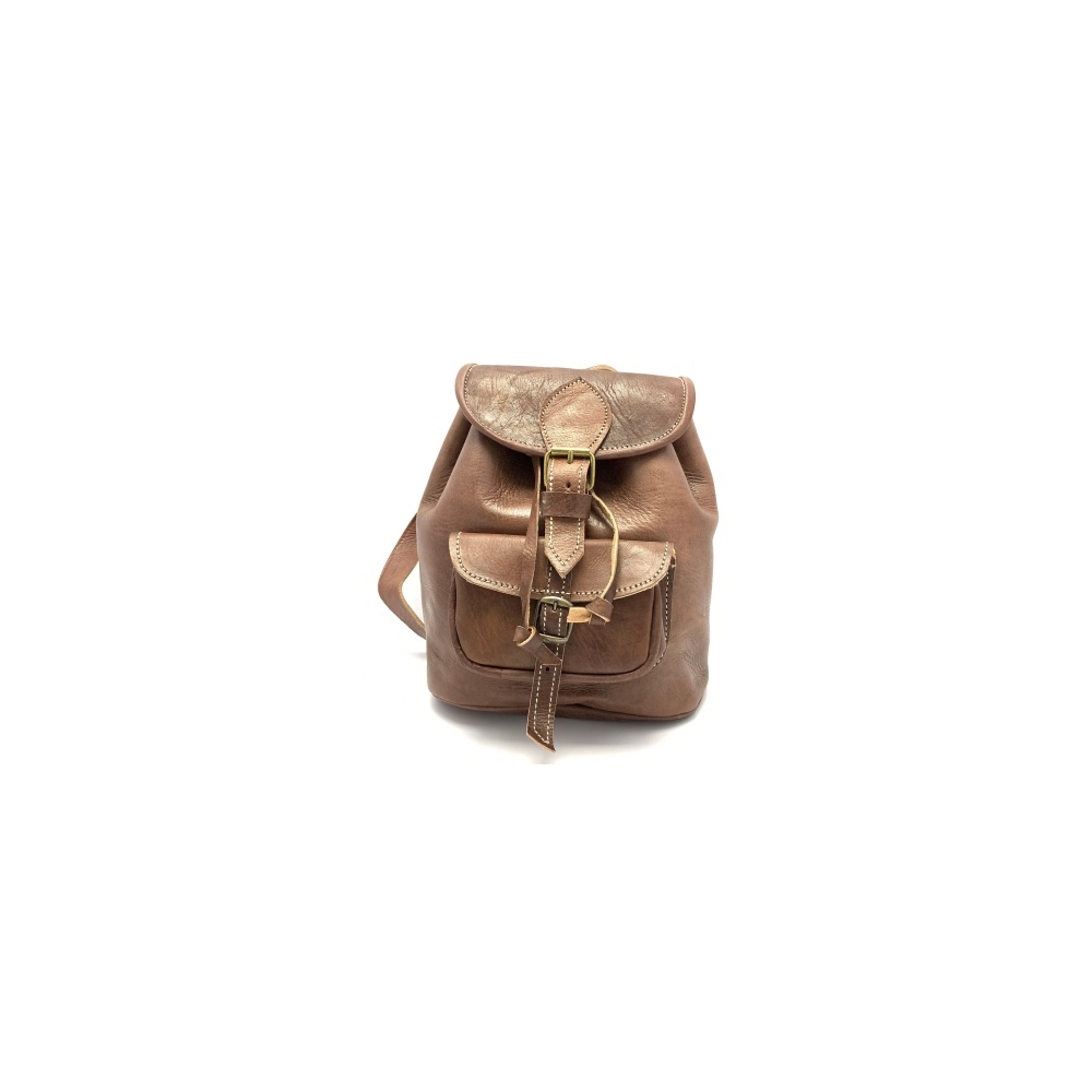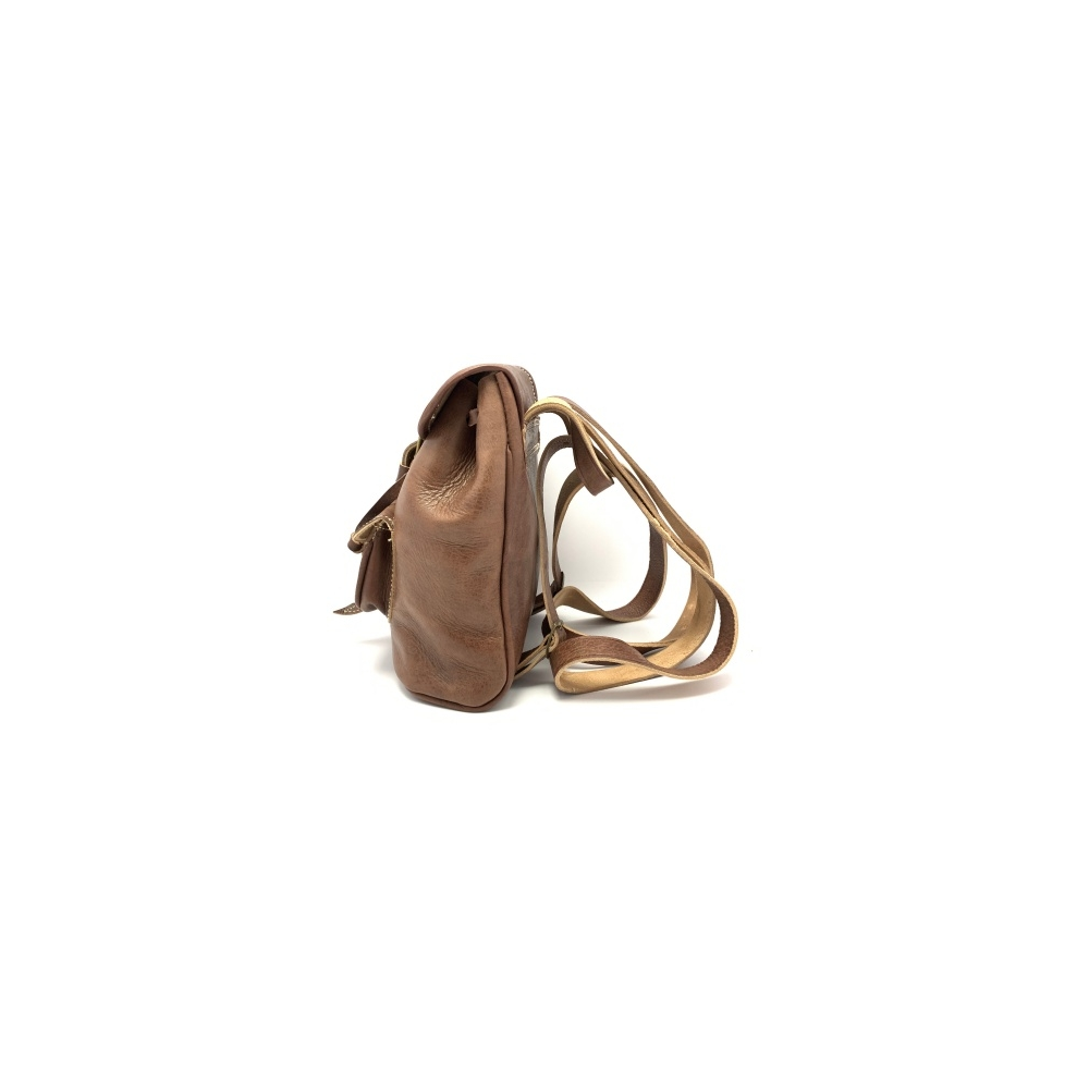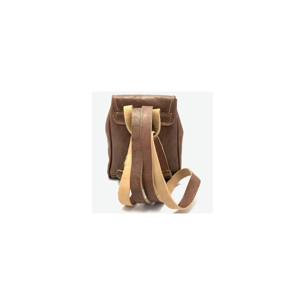 Kožený batůžek malý bez podšívky. SIlná kvalitní kůže až 9 mm, Nahoře malé ouško, dvě dlouhé nastavitelné popruhy (max délka 57 cm). Zapínání je na přezku, uvnitř není podšívka, ale kvalitní kůže. Vpředu je malá kapsička na přezku.