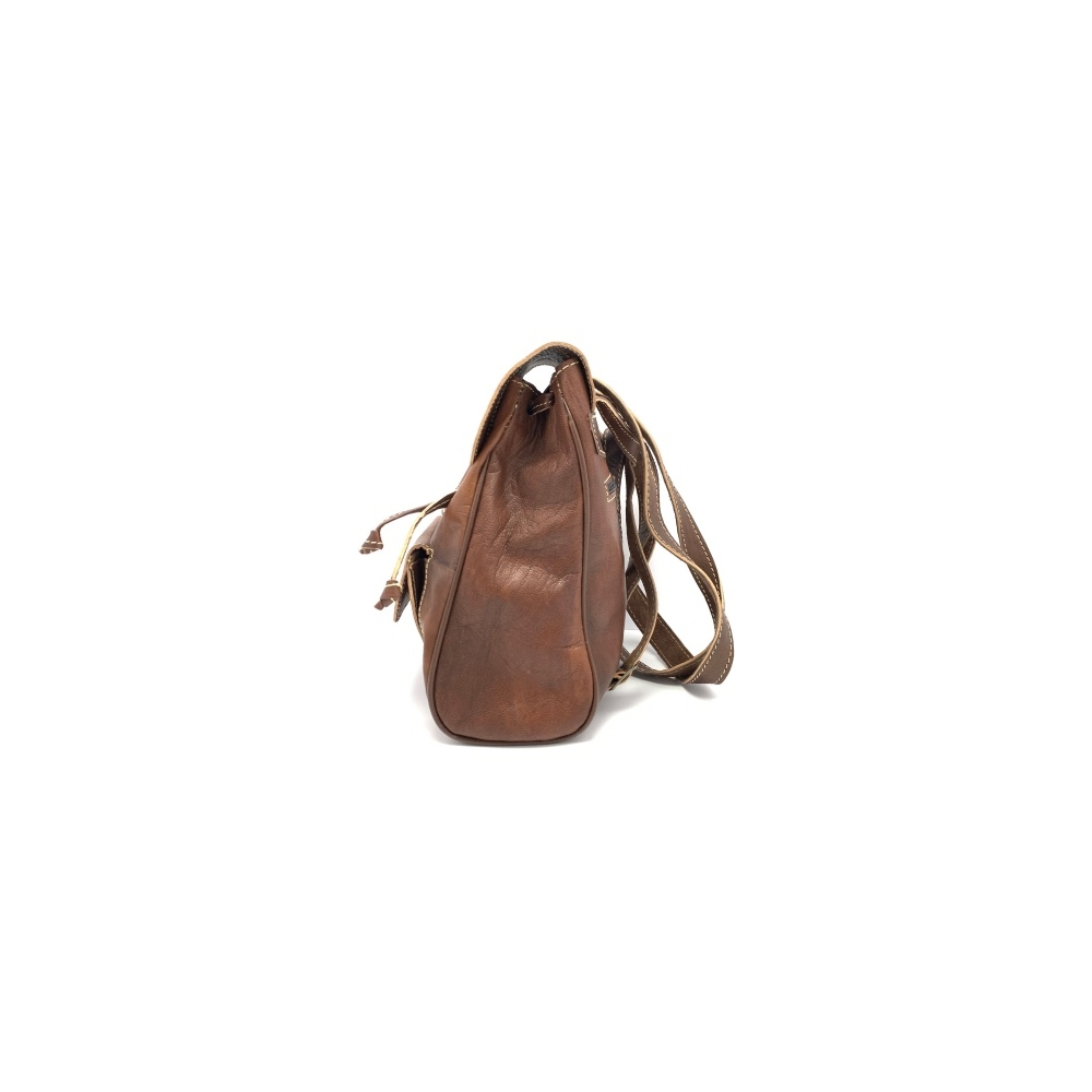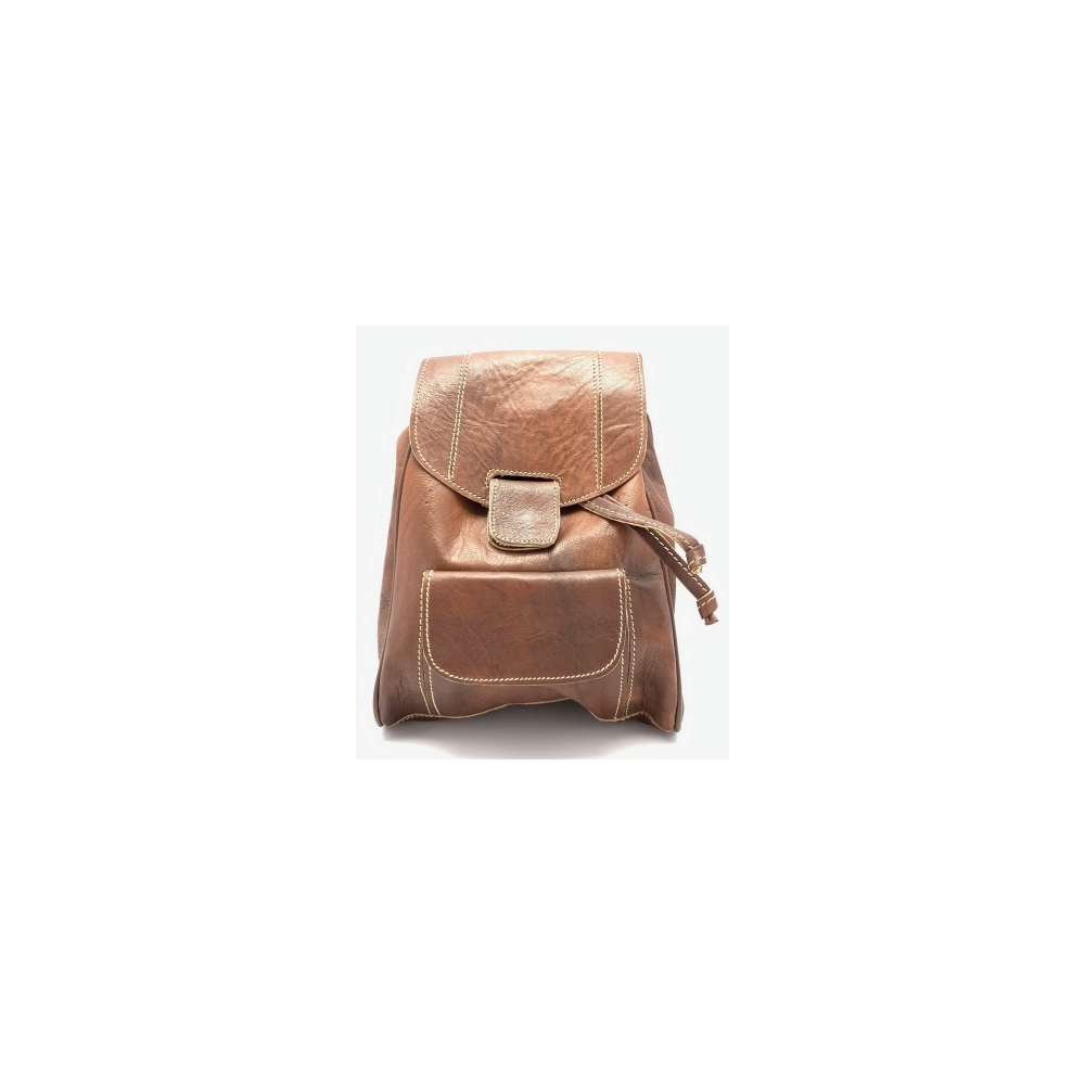 Kožený batůžek menší s podšívkou. Nahoře malé ouško, dvě dlouhé nastavitelné popruhy (max délka 36 cm). Zapínání batohu je na stahnutí a pak na druk, který ozdobně přidělán k batohu. Na přední straně batohu je kapsička na vaše drobnosti zapínací na druk.