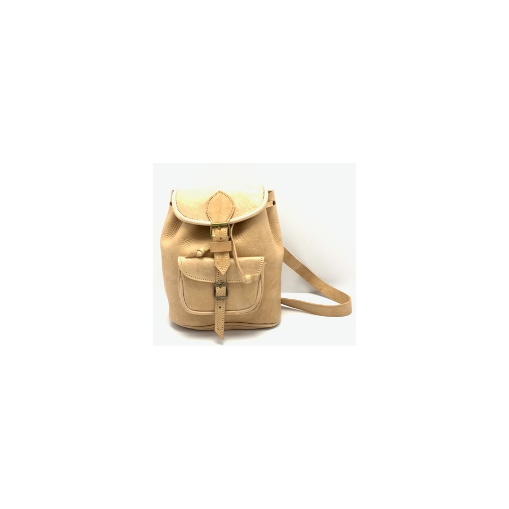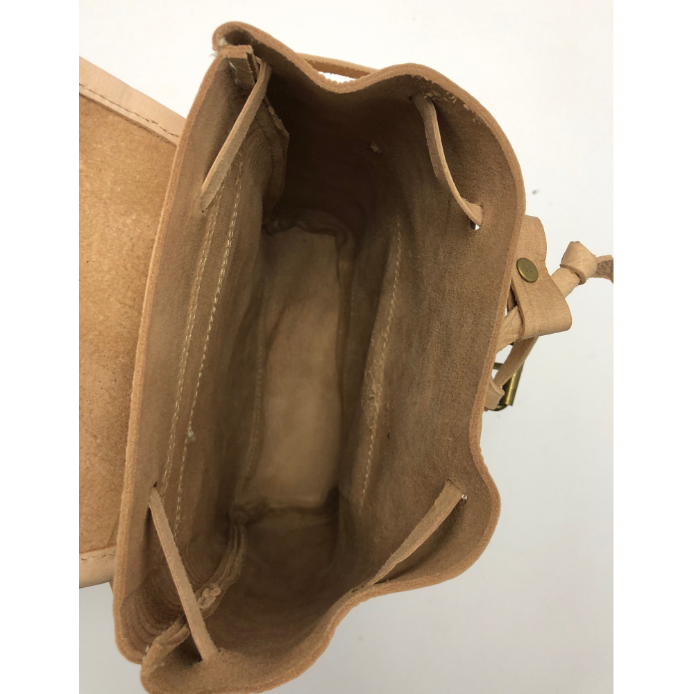 Kožený batůžek malý bez podšívky. SIlná kvalitní kůže až 9 mm, Nahoře malé ouško, dvě dlouhé nastavitelné popruhy (max délka 57 cm). Zapínání je na přezku, uvnitř není podšívka, ale kvalitní kůže. Vpředu je malá kapsička na přezku.