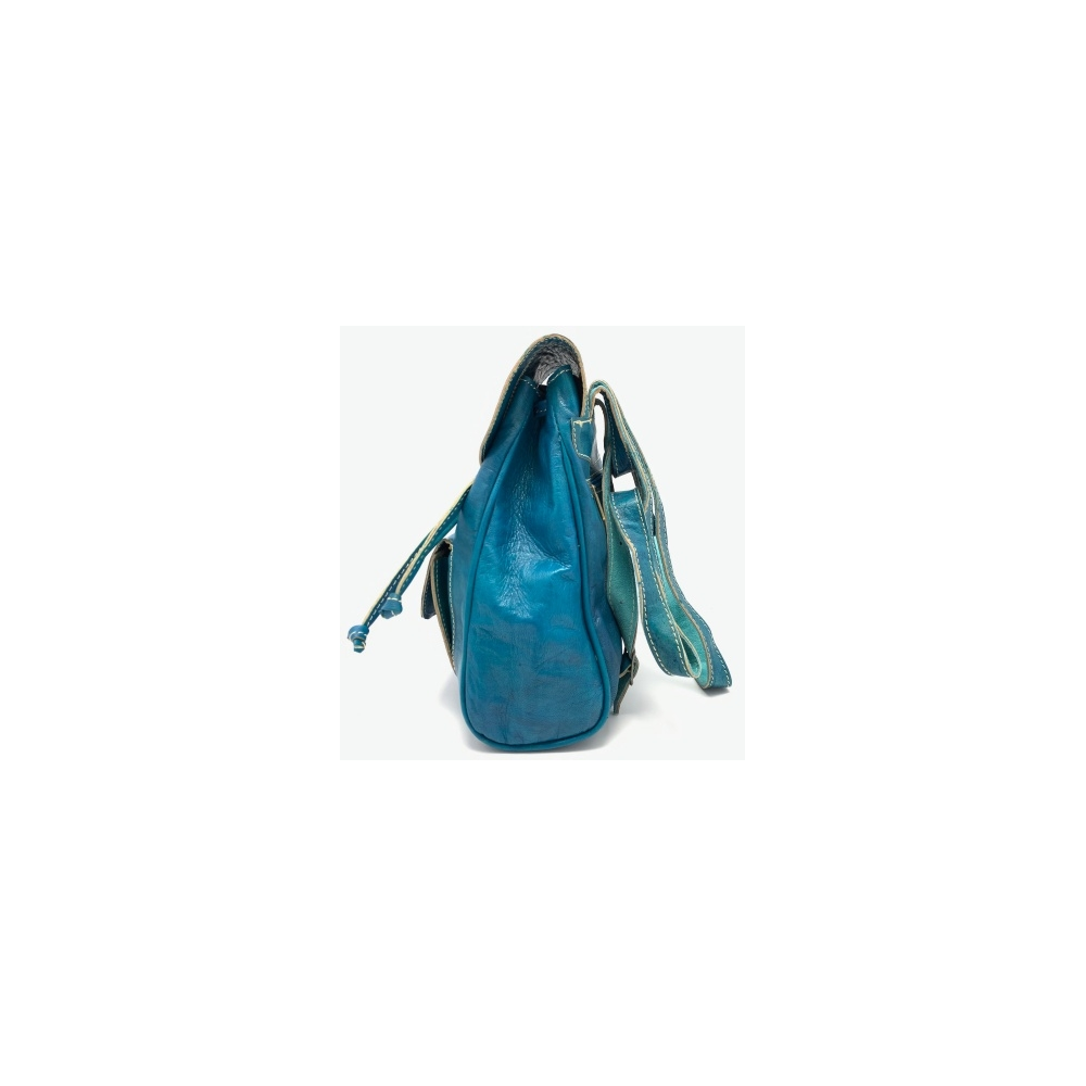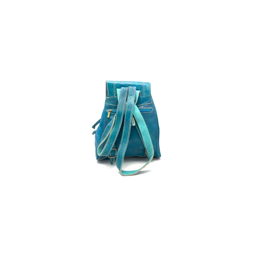 Kožený batůžek menší s podšívkou. Nahoře malé ouško, dvě dlouhé nastavitelné popruhy (max délka 36 cm). Zapínání batohu je na stahnutí a pak na druk, který ozdobně přidělán k batohu. Na přední straně batohu je kapsička na vaše drobnosti zapínací na druk.